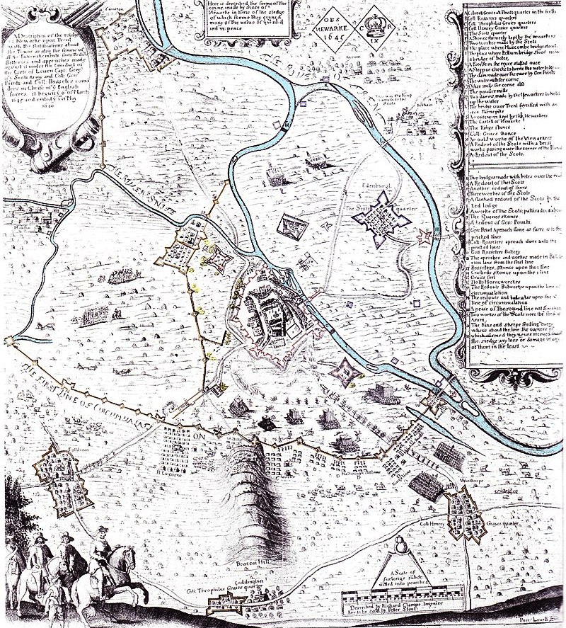 The third siege began in November 1645,when the main Scots army joined General Poyntz and his English force.  This was the first time the Newark defenders commanded by Lord John Belasyse faced determined professional soldiers.  The Scots constructed a great battering-fort they named “Edinburgh”, a siege device which was the 17th century equivalent of a malvoisin.  General Poyntz also had a giant bastion brought into play which was named “Colonel Grey’s Sconce.”  The Scots set up two boat bridges and brought up an armed pinnace which also mounted two guns manned by 40 musketeers.  These were used to penetrate the Trent River defenses to within half a mile of the castle itself.  General Poyntz also dammed the Smite River and the arm of the Trent which ran directly under the castle, putting the town mills out of action.