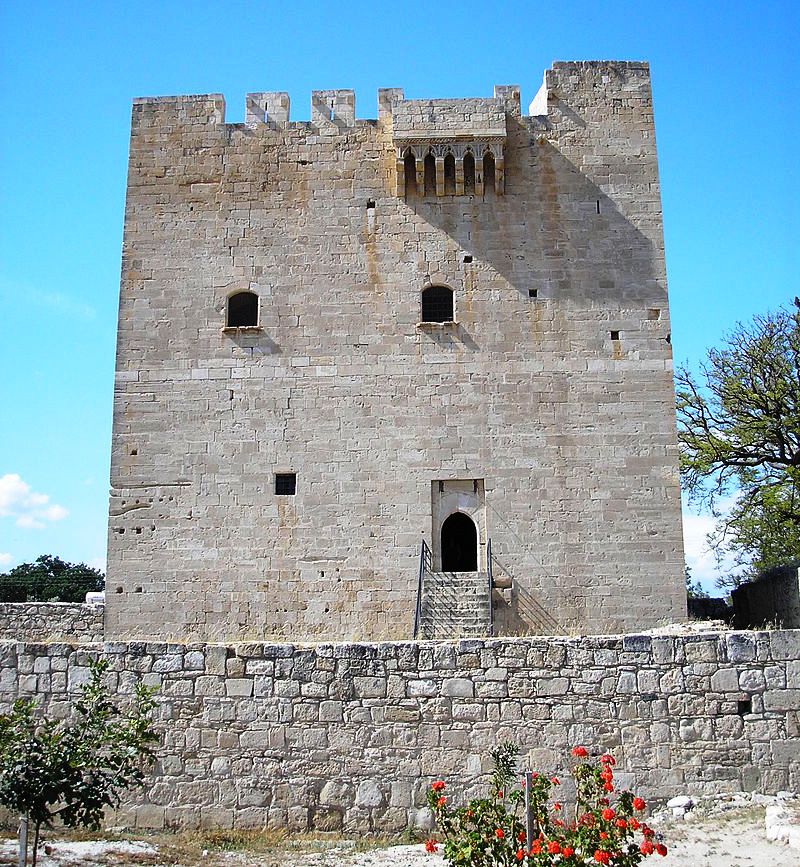 The present castle was built in 1454 by the Hospitallers under the Commander of Kolossi, Louis de Magnac, whose arms can be seen carved into the castle’s walls.  Owing to rivalry among the factions in the Crusader Kingdom of Cyprus, the castle was taken by the Knights Templar in 1306, but returned to the Hospitallers in 1313 following the abolition of the Templars.  The castle today consists of a single three-storey keep with an attached rectangular enclosure or bailey about 30 by 40 metres (98 by 131 ft).