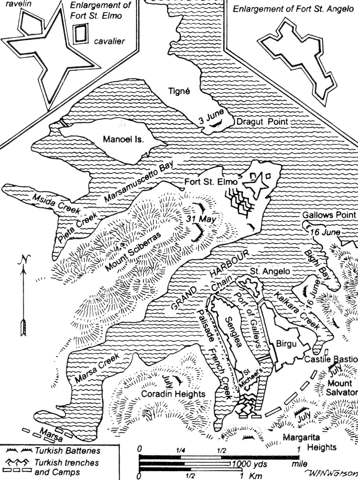 The Grand Master of the Order, Jean Parisot de la Valette had made it his business to improve the island’s defenses and developed it into a powerful fortress.  La Valette had fought at Rhodes and learned much from his many experiences in battle.  He made good use of natural and artificial obstacles, repaired old watchtowers, enlarged ramparts, strengthened walls, and deepened ditches.  La Valette realized that he could count on little in the way of aid, and set up his command to be as self-sufficient as possible.  He was left to defend the island with a force of about 600 Knights and some 8500 soldiers including 3000 Maltese regulars who fought well.