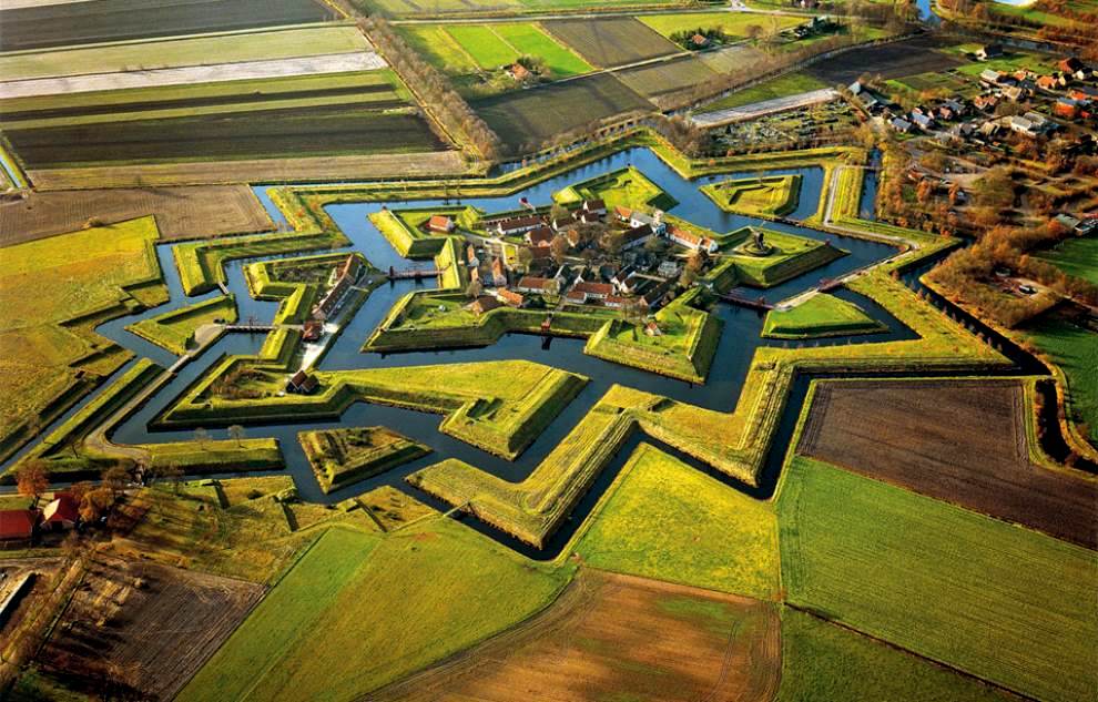 Fort Bourtange is a star fort located in the village of Bourtange, Groningen, Netherlands.  Built in 1593 under the orders of William the I of Orange, its original purpose was to control the only road between Germany and the city of Groningen, controlled by the Spaniards during the time of the Eighty Years’ War.  After experiencing its final battle in 1672, the Fort continued to serve in the defensive network on the German border until it was finally given up in 1851 and converted into a village.  Fort Bourtange currently serves as a historical museum.