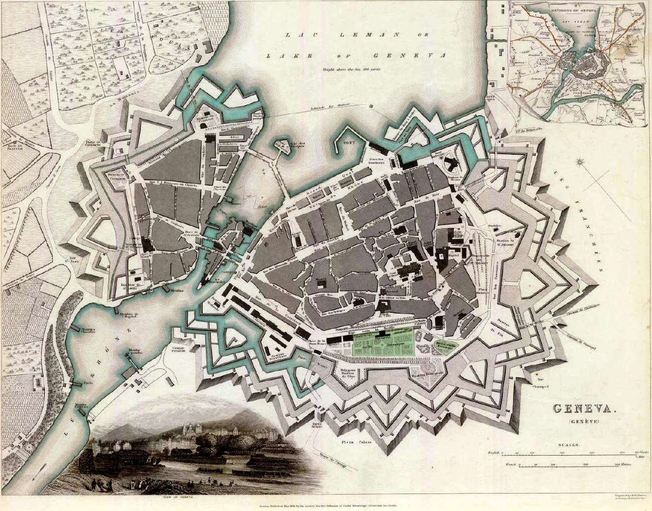 Plan of Geneva, Switzerland and environs, showing the massive fortifications in 1841, less than ten years before the start of their demolition in 1850.
