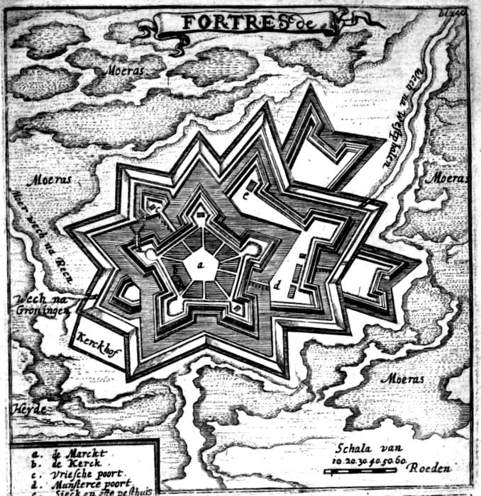 The idea of using bastions in fort design was expanded and soon multi-pointed star forts were being developed towards the end of the 16th century.  Maurice of Nassau for example, rebuilt Coevorden, Holland by adding bastions resulting in the formation of a 14-point star.