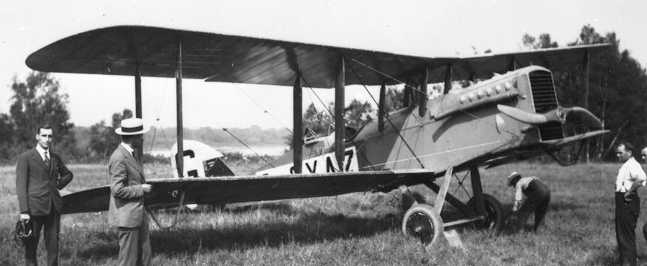 Air Board de Havilland D.H.9A, G-CYAZ, Ottawa Air Station, Ontario. Lieutenant-Colonel Robert Leckie is standing at extreme left, c1921-22.
