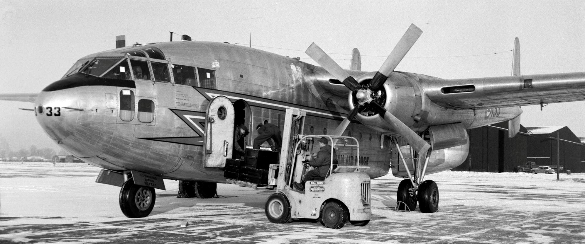 Fairchild C-119 Flying Boxcar, RCAF (Serial No. 22133) being loaded through the front and rear doors at North Luffenham, England.