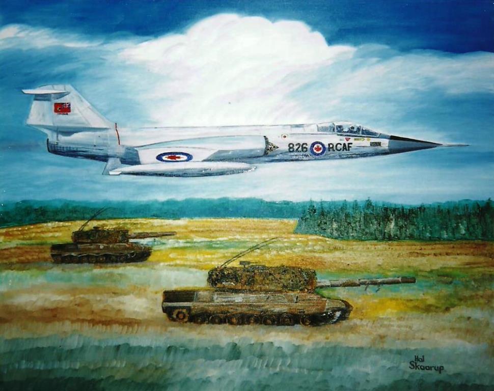 Canadair CF-104 Starfighter over Leopard tanks.