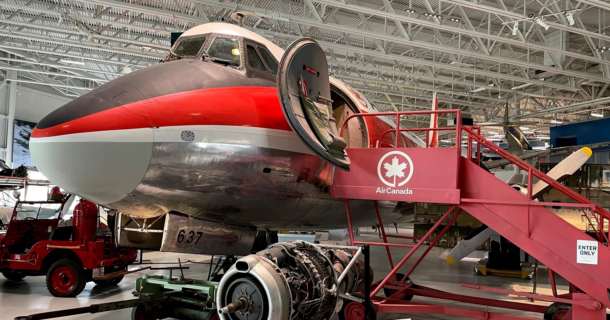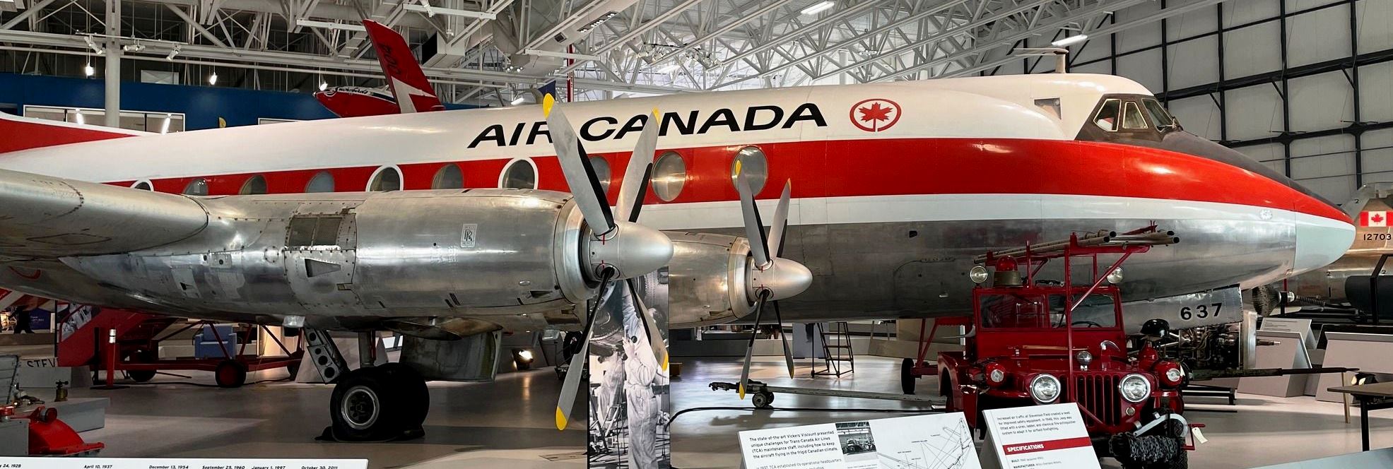The turboprop Viscounts were favoured for their speed, quietness and lack of vibration. The fleet of 51 Viscounts were used on all of TCA’s short-haul routes. This Viscount is likely intimately familiar with its home, as it operated from TCA’s Winnipeg hangar (now the Royal Aviation Museum of Western Canada) for many years. The tail fin is higher than the hangar doors, so in order to move the aircraft in and out of the hangar, the nose wheel had (has) to be jacked up. TCA had a special jack for this purpose. It is on display adjacent to the Viscount. The aircraft on display was delivered to TCA in February, 1958 and was used until May, 1971. It found its permanent home at the Royal Aviation Museum of Western Canada in 1984. (RAMWC)