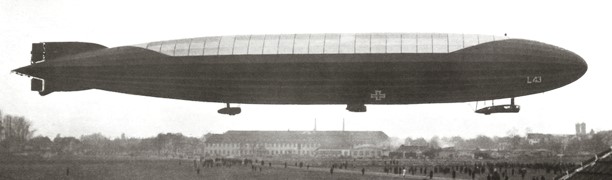 The Imperial German Navy Zeppelin LZ 112, given the tactical number L 70, was the first of three X-class / L70-class First World War zeppelins of the Imperial German Navy. It is shown here in flight during the war. On 5 Aug 1918, L 70 was intercepted and destroyed over the North Sea by a British de Havilland DH-4 flown by Major Egbert Cadbury with Captain Robert Leckie.