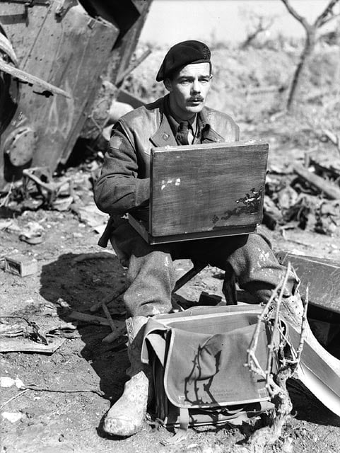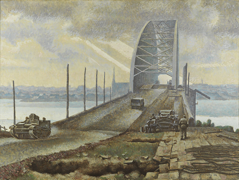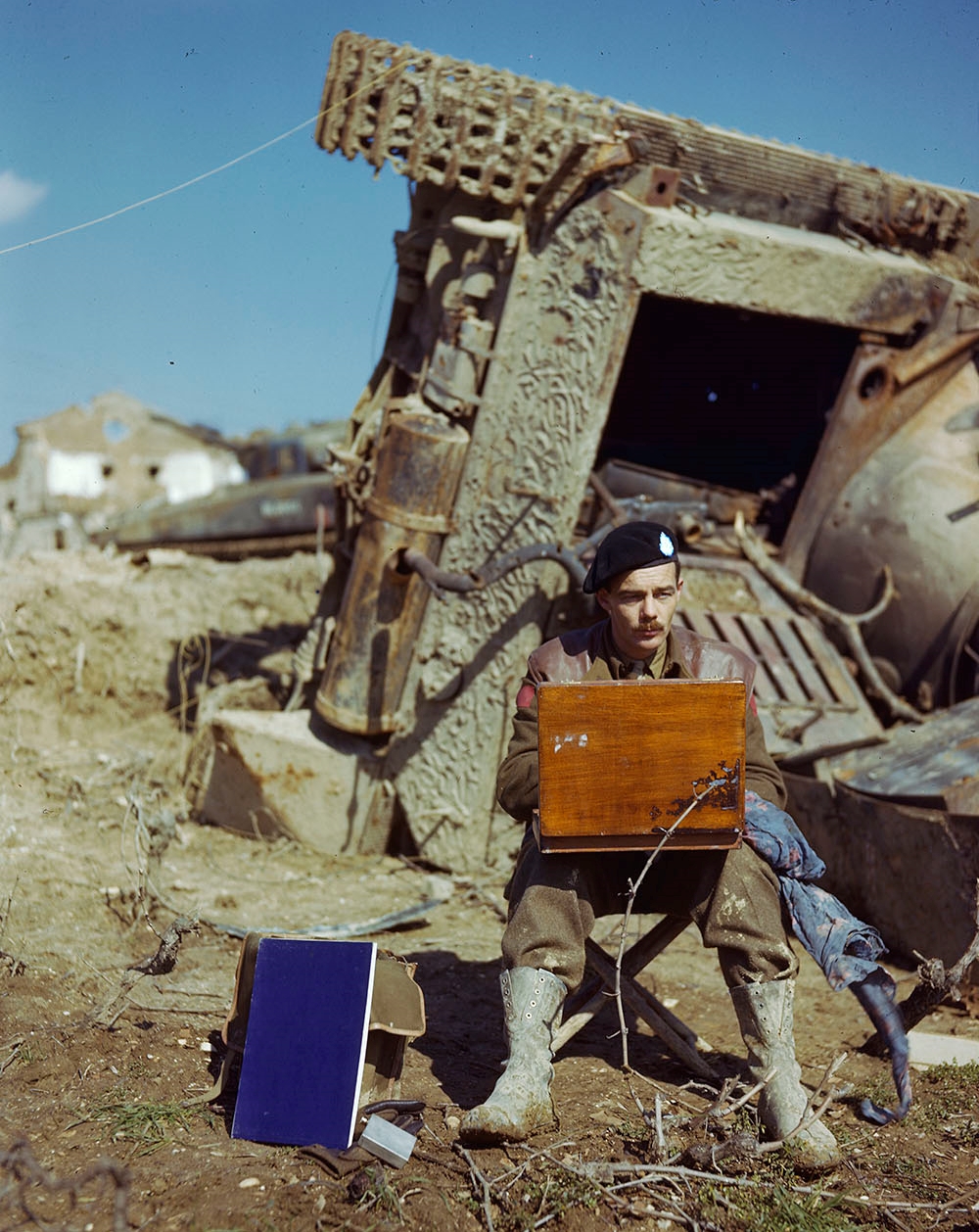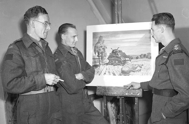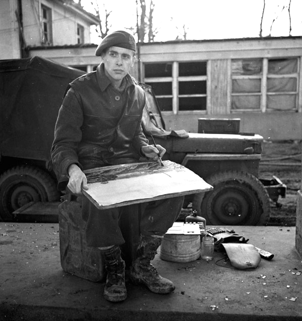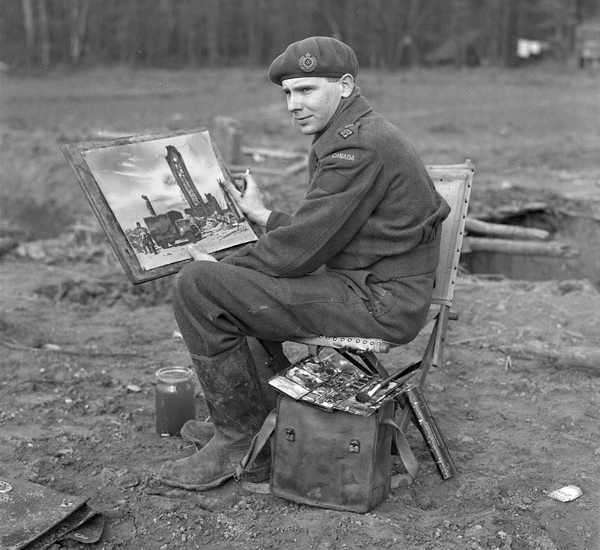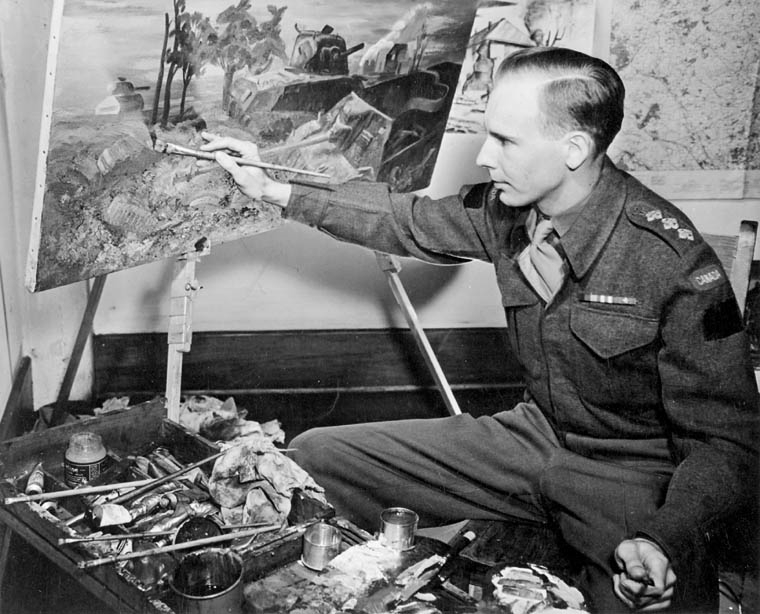 Lieutenant D. Alex Colville, War Artist, 3rd Canadian Infantry Division, Keppeln, Germany, 4 March 1945. Internationally recognized as one of Canada’s leading artists, Alex Colville spent most of his youth in Amherst, Nova Scotia, and later attended nearby Mount Allison University in Sackville, New Brunswick. After graduation he joined the Canadian Army and was appointed a war artist. Upon arriving in London, Colville was stationed with a supply unit in Yorkshire. He subsequently travelled to the Mediterranean, Belgium, the Netherlands, and Germany. In 1946 he returned to Mount Allison as a teacher. Following his retirement in 1963, Colville devoted all of his time to painting. He moved to Wolfville in 1973 and from 1981 to 1991 served as Chancellor of Acadia University. (Canadian War Museum)
