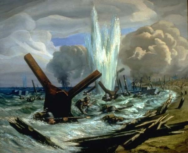 Orville Fisher’s paintings of the Second World War constitute one of the most complete records of Canada’s day-to-day role in that conflict. Perhaps his chief claim to fame is that he was the only Allied war artist to land in Normandy on D-Day, 6 June 1944. This achievement is all the more extraordinary given the fact that he almost never made it overseas in the first place. Fisher worked as a service artist with the Canadian Army beginning in February 1942, and a year later became an official war artist. He did not re-enter civilian life until July 1946. As a war artist, and undoubtedly as a person, Fisher was a determined and creative man. In preparation for the D-Day invasion, he strapped tiny waterproof pads of paper to his wrist. After racing up the beach from his landing craft, Fisher made rapid, on-the-spot sketches, using perfectly dry materials, of the battle unfolding around him. Later, the artist created larger watercolour paintings away from the battlefront. Unlike fellow war artist Charles Comfort’s reconstruction of the August 1942 Dieppe Raid that was created four years after the event in the peace and security of a studio, Fisher’s D-Day – The Assault was based on a real-life experience of action replete with all the turmoil and blood. Attached to the 3rd Canadian Infantry Division, Fisher landed on the beach at Courseulles-sur-Mer. The first 20 minutes of Stephen Spielberg’s film Saving Private Ryan arguably re-creates the artist’s D-Day experience in all its horror.