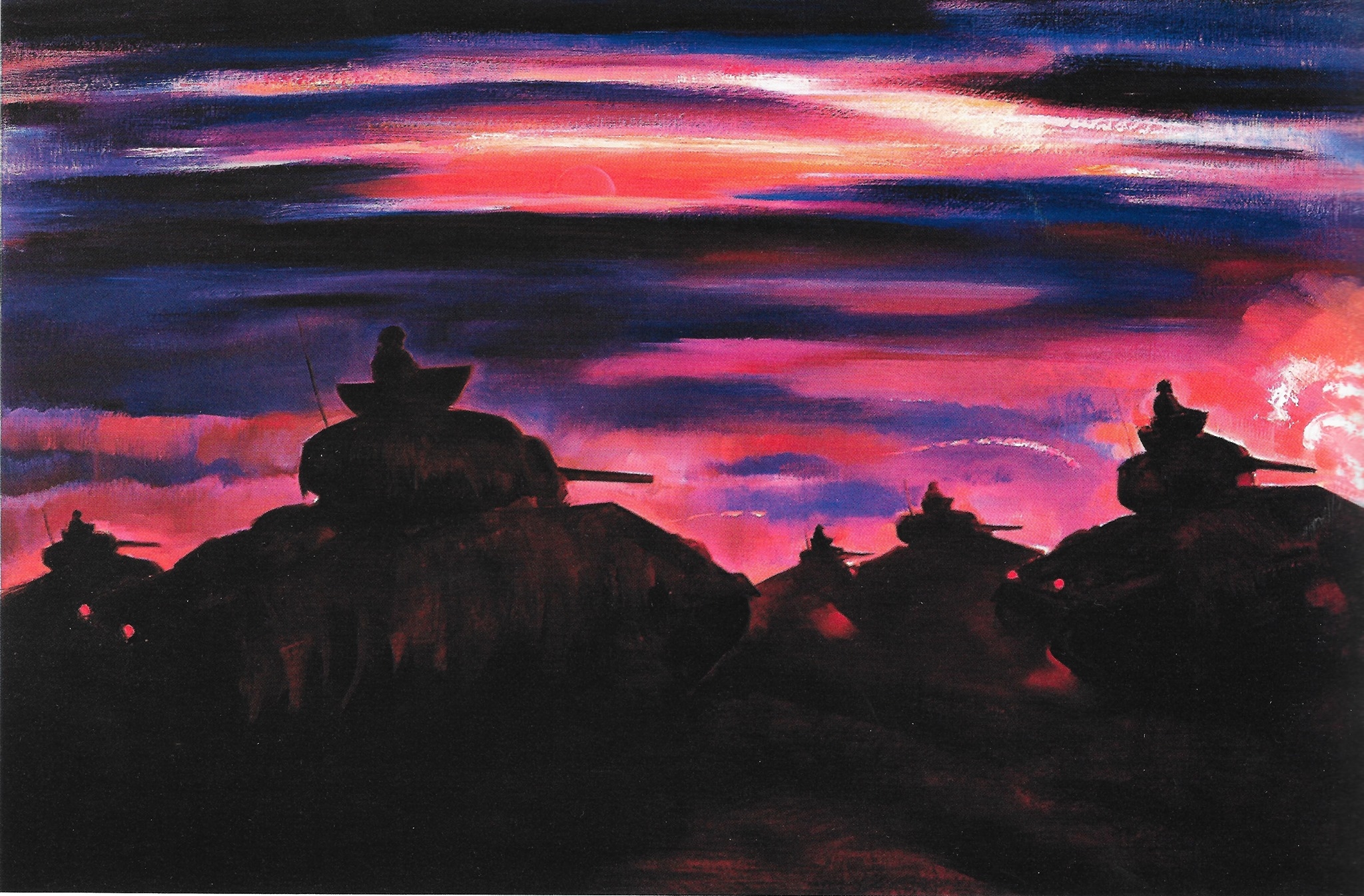 Tanks Moving Up for the Breakthrough, by George Pepper. This painting depicts the night advance during the first phase of Operation Totalize. (1st Hussars Museum)
