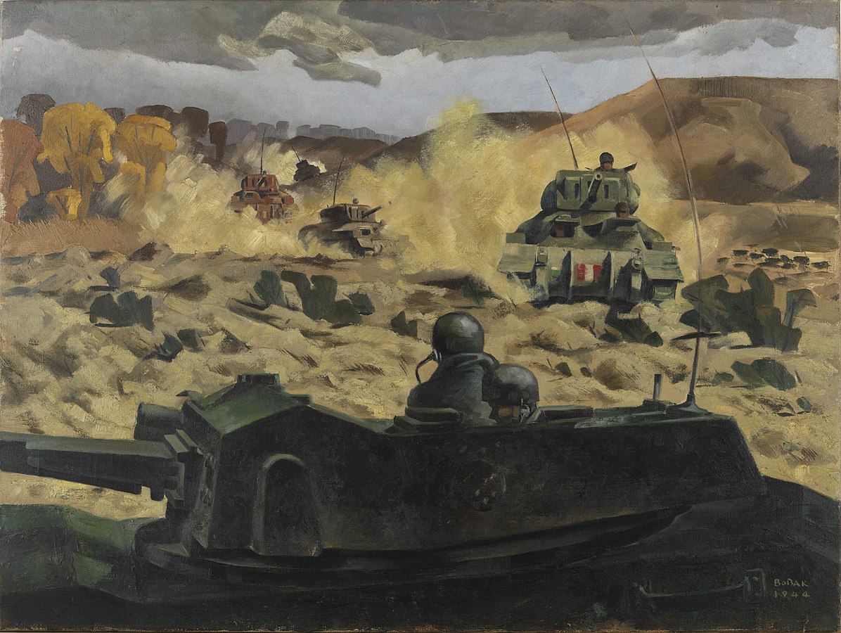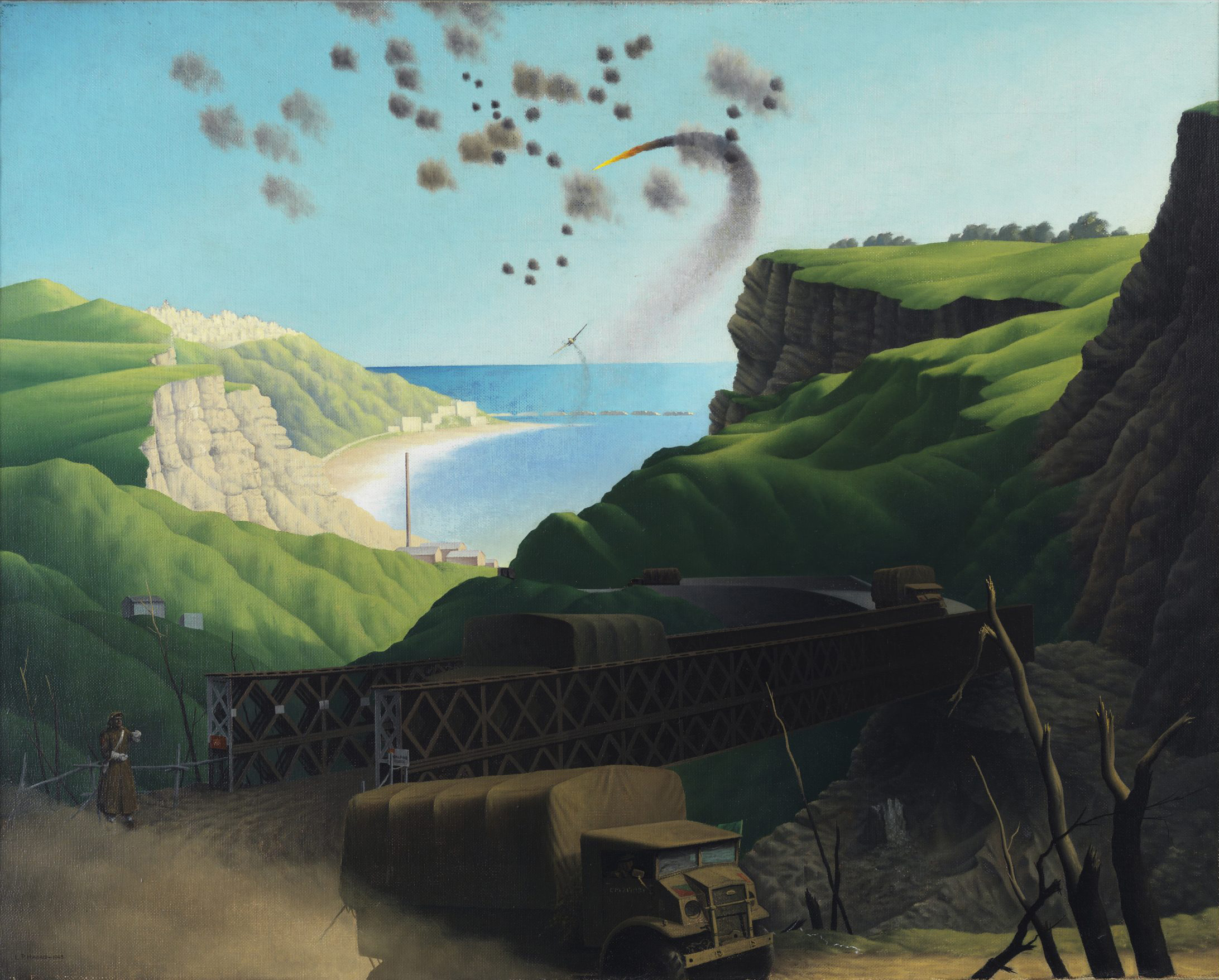 Harris served with the Governor General’s Horse Guards (3rd Canadian Armoured Reconnaissance Regiment) during the first three years of the Second World War. As a war artist he remained with them in Italy as part of the 5th Armoured Division during 1944. Most of his war landscapes depict tanks in the spectacular hilly landscape near the Melfa and Liri Rivers and towards Ortona. (Canadian War Museum)
