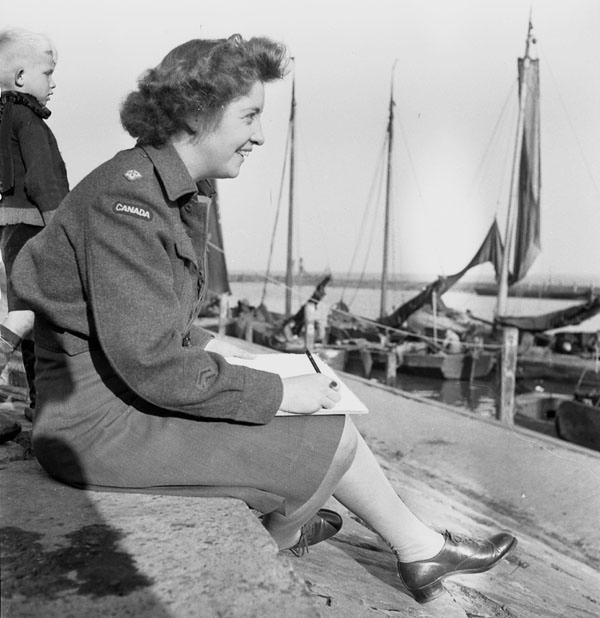 War artist 2nd Lieutenant Molly Lamb, Canadian Women’s Army Corps (CWAC), sketching at Volendam, Netherlands, 12 September 1945.