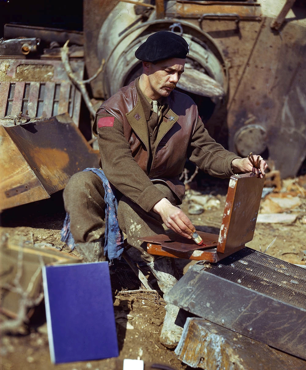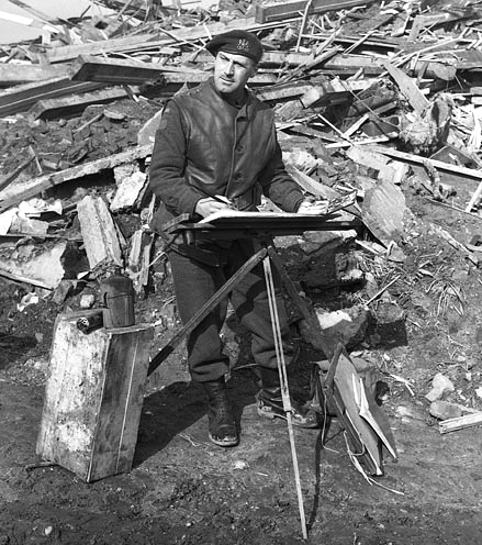 Captain George Pepper, a Canadian war artist attached to the 2nd Canadian Infantry Division, painting in the ruins of the courthouse / jail, Cleve, Germany, 9 March 1945.