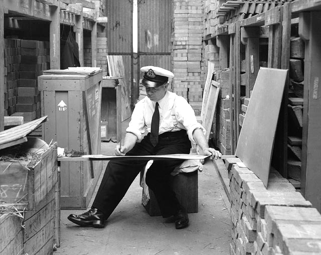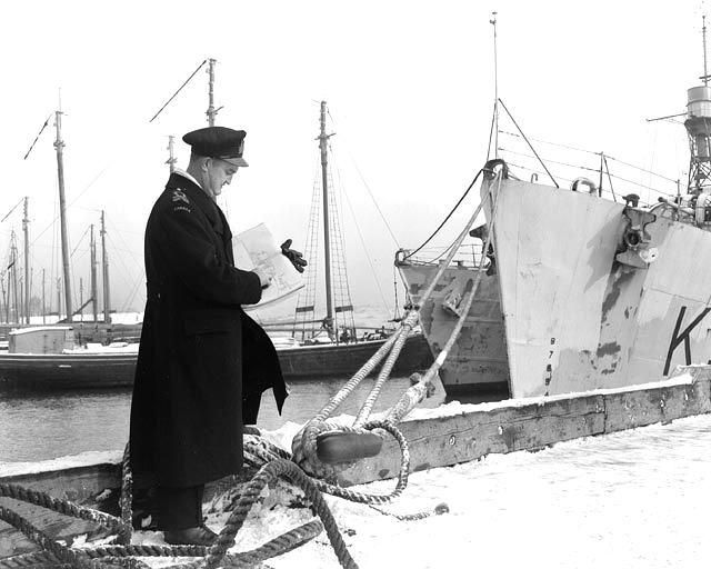 Lieutenant (SB) Tom Wood, Canadian Naval War Artist, sketching a ship in Newfoundland, 2 Feb 1945.