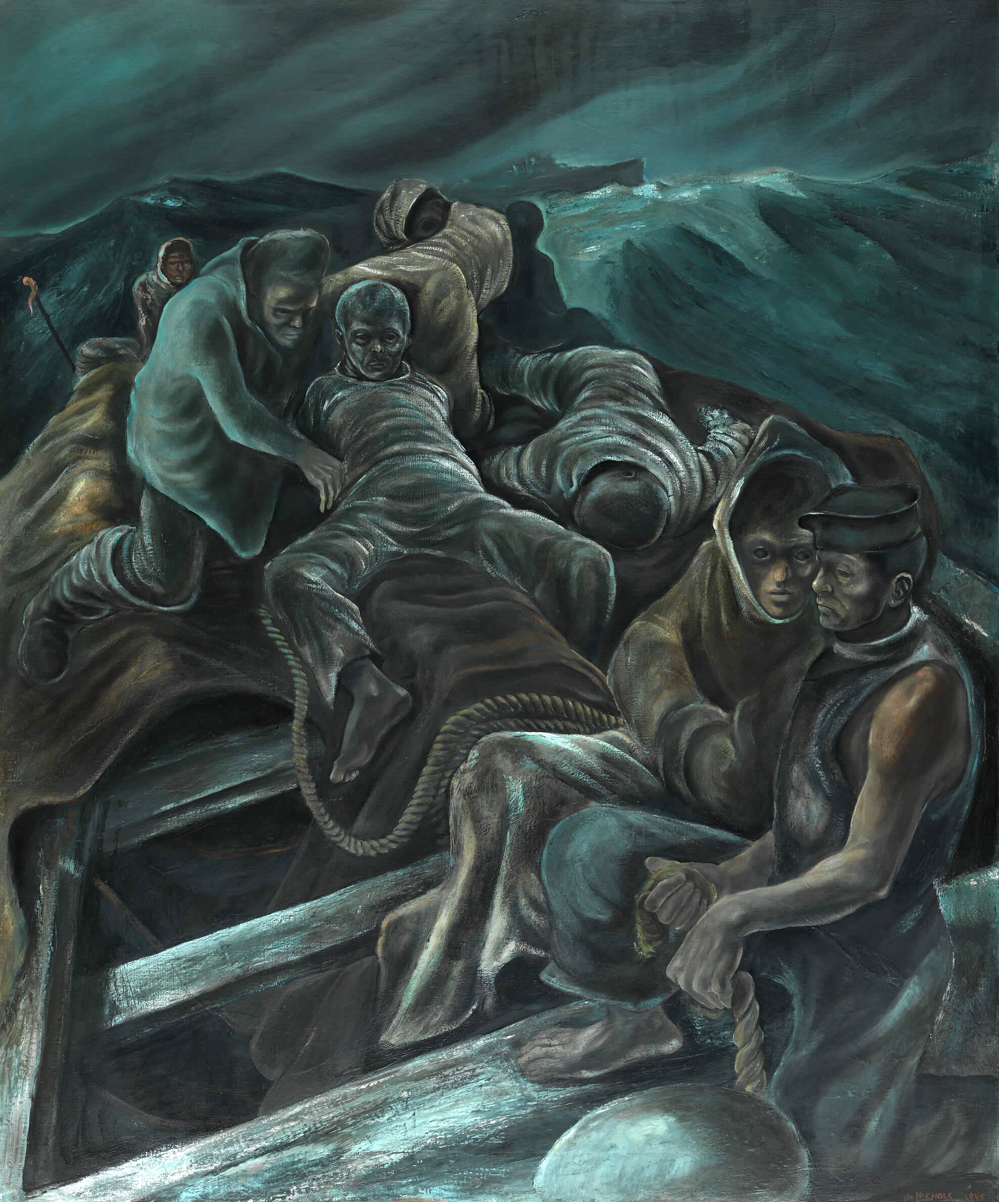Lt (N) Jack Nichols, Canadian war artist. Born in 1921 in Montreal, Jack Nichols was largely self-taught as an artist. In the fall of 1942 he served as a deckhand on a Great Lakes freighter. His combination of skills led to a 1943 commission from the National Gallery of Canada to depict the activities of the Canadian Merchant Navy. In February 1944 he was enrolled as a sub-lieutenant in the Royal Canadian Naval Volunteer Reserve, and was appointed an official Canadian war artist in April 1944 with the rank of lieutenant. Nichols was present at the D-Day landings in Normandy in June 1944, later sketched on a number of warships, and was on board HMCS Iroquois during the attempted evacuation of Brest by the Germans in August 1944. Nichols was released from the navy in October 1946. Nichols’s drawings form the bulk of his official war art. Acutely sensitive to his subjects’ feelings and reactions, Nichols in his drawings (and paintings) does not shy away from the ever-present spectre of death, a quality underlined by the blackness of the medium in many cases.
