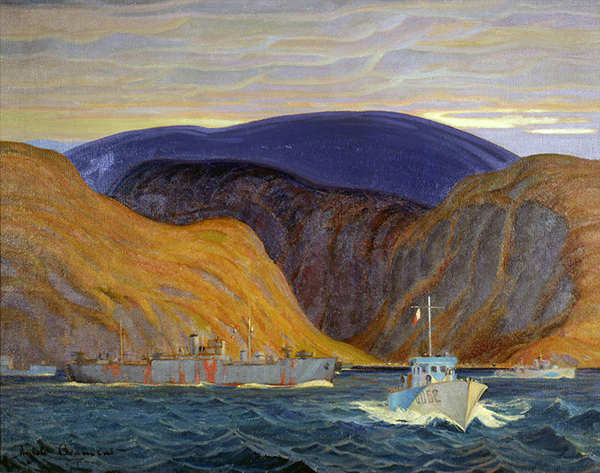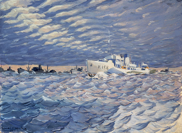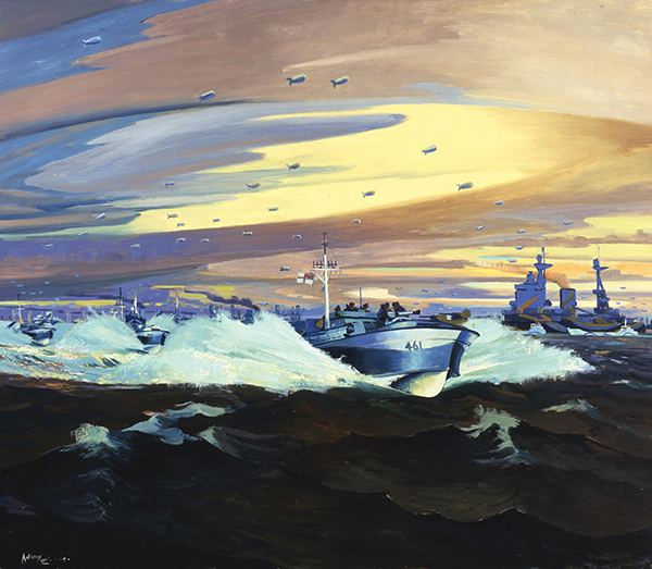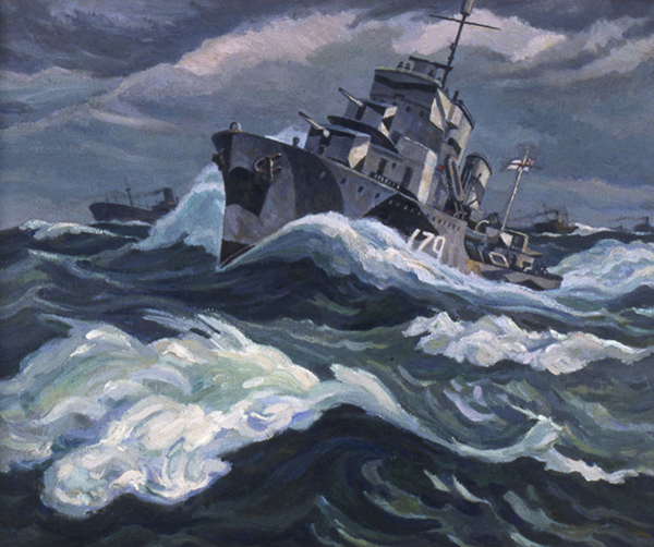 Commander Anthony Law, DSC, RCN was one of Canada’s most notable naval official war artists of the Second World War. He was unique in that he served as a naval officer throughout the conflict and in the period after the war. He retired in 1966. During his long and distinguished career as a naval officer he also worked as a professional artist. As a young man in the early war years, he served on a number of motor torpedo boats in the English Channel, and was involved in the action against the German battlecruisers Scharnhorst and Gneisenau in 1942. In this period he still found time to paint, usually when ashore during refits. In 1943, for example, he received a temporary assignment that enabled him to record some of Canada’s more notable vessels, including HMCS Haida, Chaudière, Huron, and Restigouche. Law’s response to how he painted the war at sea was recorded in an interview he gave to the Quebec Chronicle-Telegraph in December 1943. When asked how he could recall subjects clearly after periods of heavy action, he responded in some detail. “Certain subjects, phases of battle, for instance, form unforgettable scenes in one’s mind. Such as lovely designs of star shells, flak and the horrors of war, ships sinking or on fire. Highlights of action sometimes cannot be forgotten for a long time. I remember a certain night when we met a large enemy convoy heavily escorted. They put twelve star shells into the sky that was looking so beautiful. It was just like the 24th of May. That was the subject of my painting showing our boats in the middle of the night, with all the details shown because of the brilliant light coming from the star shells. And as the battle was progressing, dawn broke east and we could see the enemy convoy ships silhouetted against the horizon. That was a scene that I can still see today in my mind. It was simply unforgettable. And it was easy to reproduce it on the canvas.”