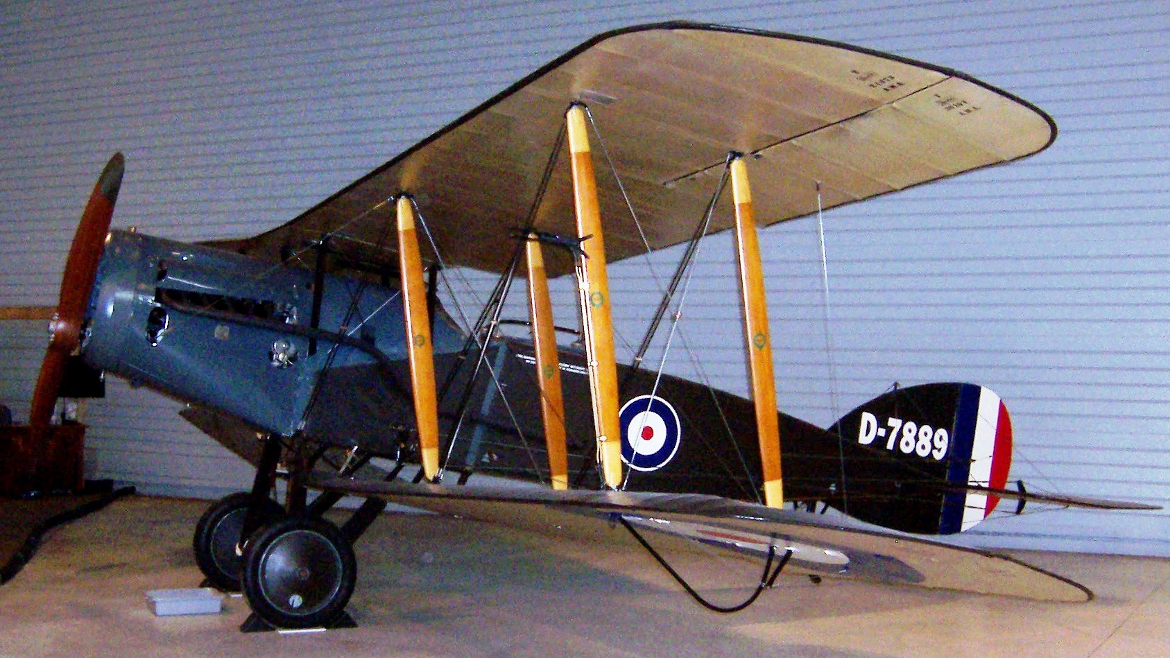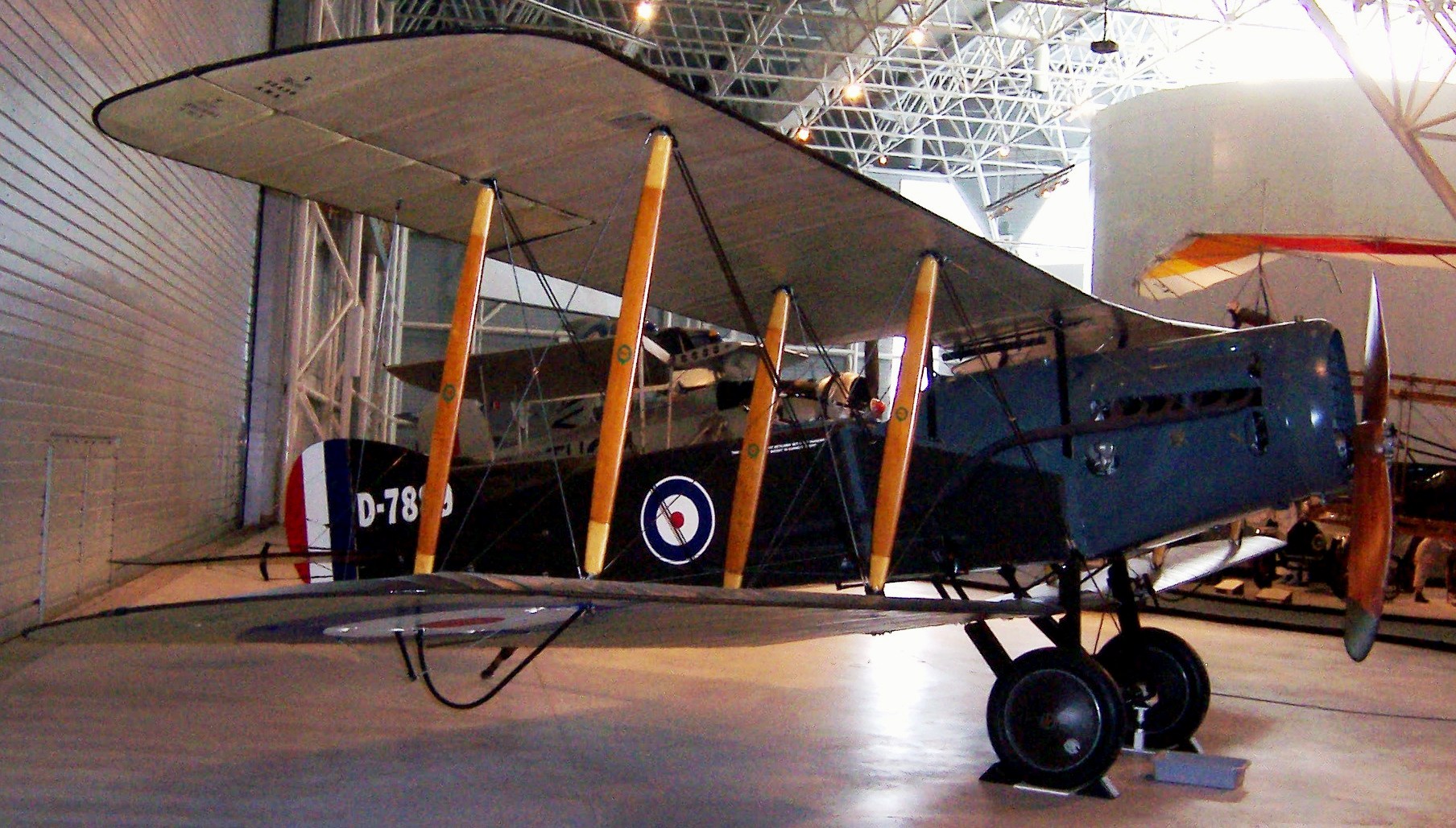 Bristol F.2B Fighter (Serial No. D-7889).  The Canada Air & Space Museum’s aircraft is one of only three original Bristol Fighters still in existence worldwide.  It was built by the Bristol Aeroplane Company in 1918.  It has been identified as aircraft D7889, as this number was stencilled on the remains of the aircraft’s original engine cowling. Details of its service career are unknown, since most of the war records of the RFC were destroyed during bombing raids in London during the early 1940s.  The aircraft was restored by the Historic Aircraft Collection in the United Kingdom from the 1980s to early 2006.  That same year, it flew in several aerial displays in Britain, powered by the world’s oldest airworthy Rolls-Royce aero engine.  The Museum acquired the Bristol Fighter in 2006, through trade of one of its 1945 Heinkel He-162 War Prize aircraft.  (CA&SM)