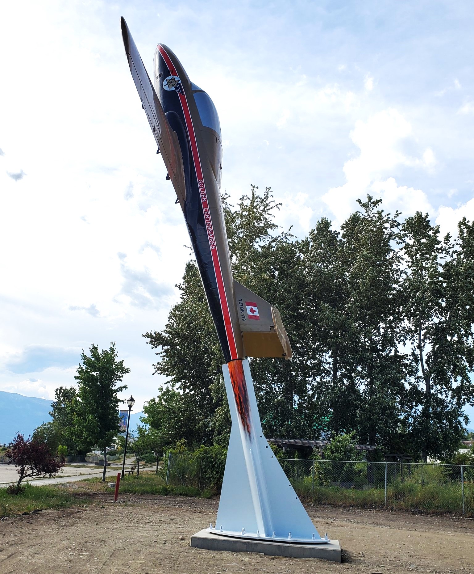 Canadair CL-41/CT-114 Tutor (Serial No. 114187), between Millennium Park and College of the Rockies. Canadair 114187, was TOS on 2 June 1966. On 8 January 1971 it was renumbered from RCAF No. 26187. It was operated by 3 CFFTS at CFB Portage, Manitoba. Later at ATESS, CFB Mountain View, Ontario, with a tail from No. 114063. It was reported as available for sale to museums in May 2005. Components were seen stored outside at CFB Mountain View, Ontario, in October 2005. This Tutor was moved to Norwood, Ontario by December 2005, where it was slated to be part of a Snowbirds static display. It was stored outside at Norwood-Kelly airfield in August 2009. SOS: 23 August 2005. It was preserved for a time at the Memorial Military Museum, Campbellford, Ontario, before being moved to Creston, BC.