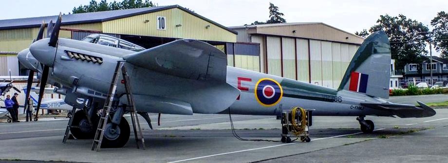de Havilland DH 98 Mosquito, B Mk. 35 (Serial No. VR796), Reg. No. CF-HMJ, Bob Jens.  North Saanich.  This aircraft is flying as (Serial No. LR503), GB-F, “F-for-Freddie“, RAF 103 Squadron.  The aircraft was too late for the war but was with Spartan Airways, mapping the north. It was then used as a training aid for Air Cadets in Northern Ontario and eventually moved to BC where it was restored.   CF-HMJ made its first flight after restoration on 16 June 2014 at Victoria International Airport, BC.  The original LR503 served with No. 105 Sqn, RAF and later flew on a publicity tour of Canada.  This aircraft was built by Airspeed in the UK in 1948 and was later operated by Spartan Air Services from 1954 to 1963.  Vancouver, British Columbia. This Mosquito will join the aircraft collection at the Okanagan-based KF Aerospace Centre for Excellence in 2022.