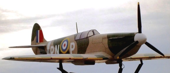 Supermarine Spitfire replica, (Serial No. 788), RN-P, mounted on iron pylons.  ANAF Vets Unit No. 5, 2500 46th Ave.  The letters and numbers on the plane were taken from the logbook of a Spitfire flown by the late Second World War pilot Phillip Bodnarchuk.