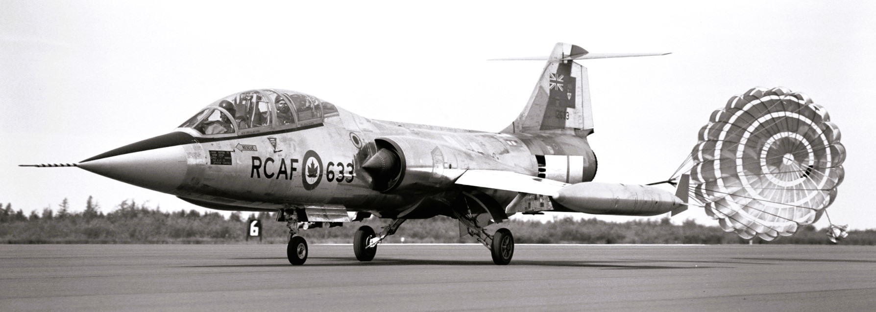 Lockheed CF-104D Starfighter, RCAF (Serial No. 12633) on the landing roll out with its drag chute deployed.  The Safety Systems techs recovered and packed theses chutes. This aircraft has been acquired by KF Aerospace, Kelowna, as of 2 June 2023.