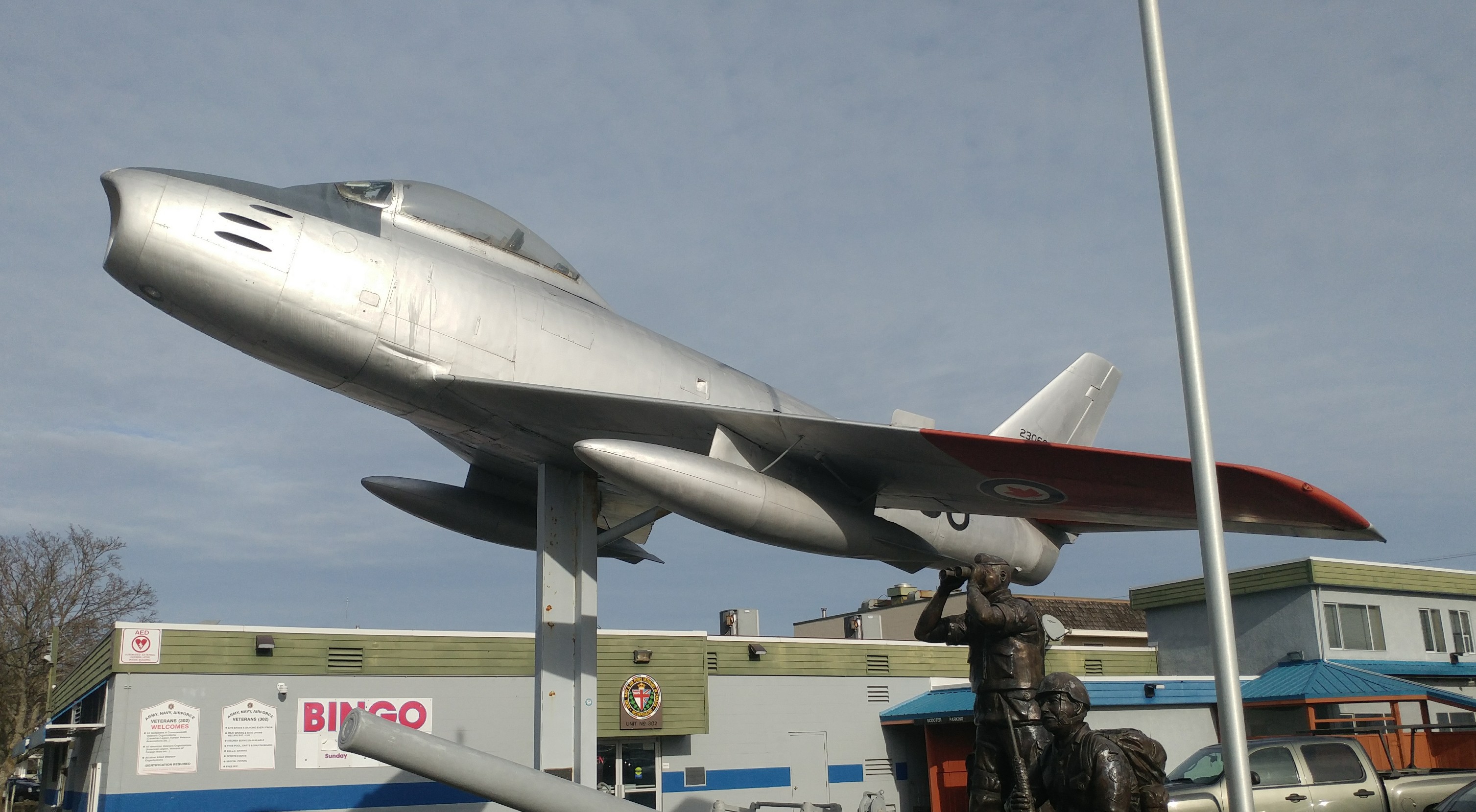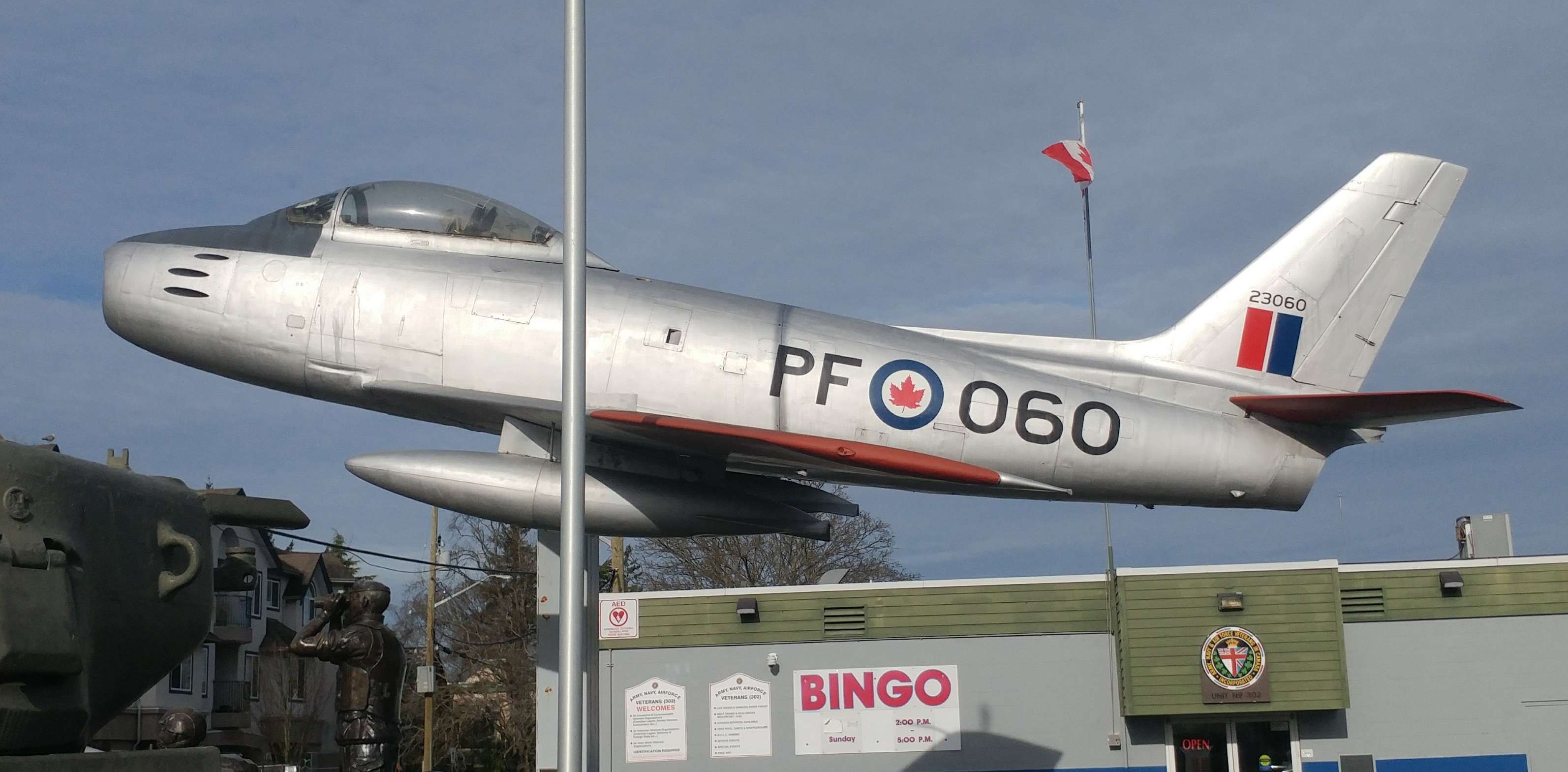 Canadair F-86 Sabre Mk. VI, RCAF (Serial No. 23060).  Silver, mounted on a pylon in front of the Army, Navy and Air Force Association Veterans Club No. 302 – 9831 – 4th Street.