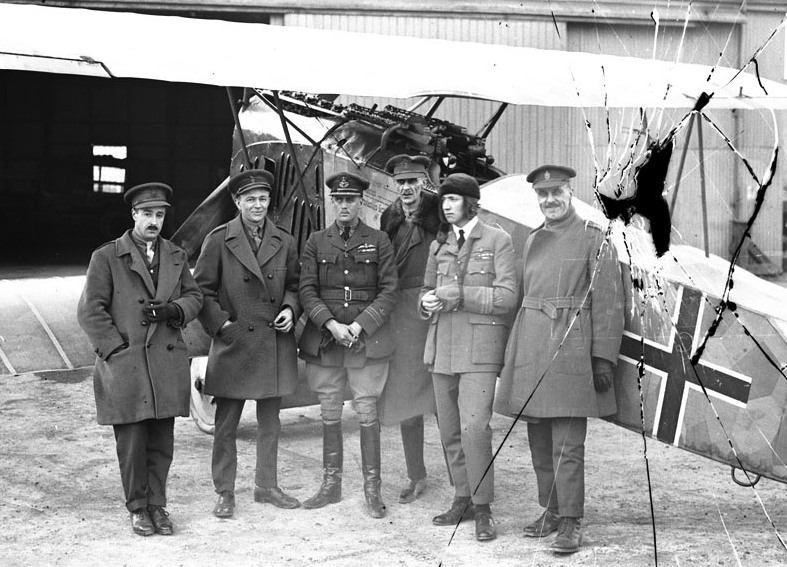 Fokker D.VII (Serial No. F 7728/18) with Major W.G. Barker, VC, and visitors at Hounslow Aerodrome, UK, 20 April 1919.