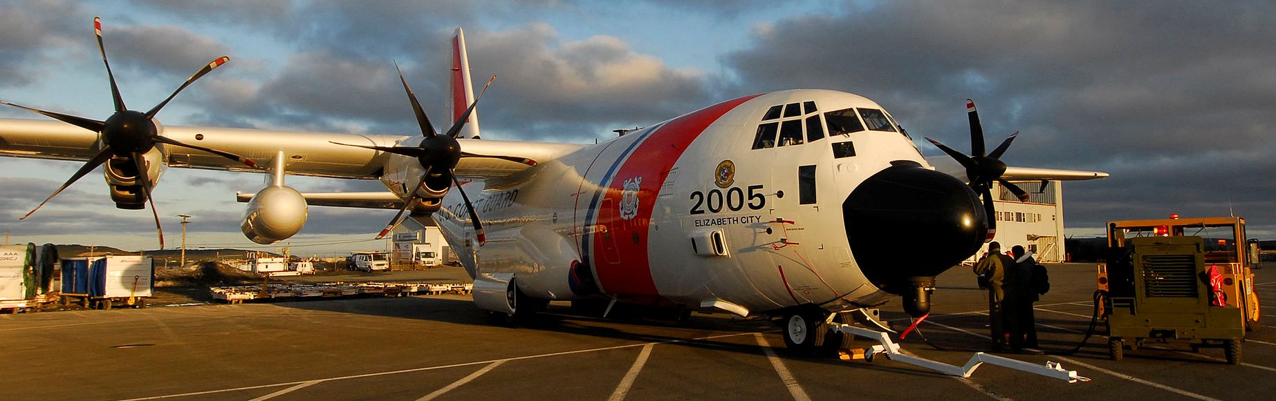 Lockheed C-130J Hercules from U.S. Coast Guard Air Station Elizabeth City, North Carolina, visiting St. John’s. The crewmembers are conducting routine safety checks on the aircraft in preparation for a mission supporting the International Ice Patrol as they search the North Atlantic for icebergs, 30 Mar 2012. The air crew was deployed to St. John’s on an aerial reconnaissance mission supporting the International Ice Patrol as it gathers data on ice conditions, icebergs and their movements in the North Atlantic. The headquarters of the International Ice Patrol is in New London, Connecticut. (Chief Petty Officer Bob Laura Photo, US Coast Guard)