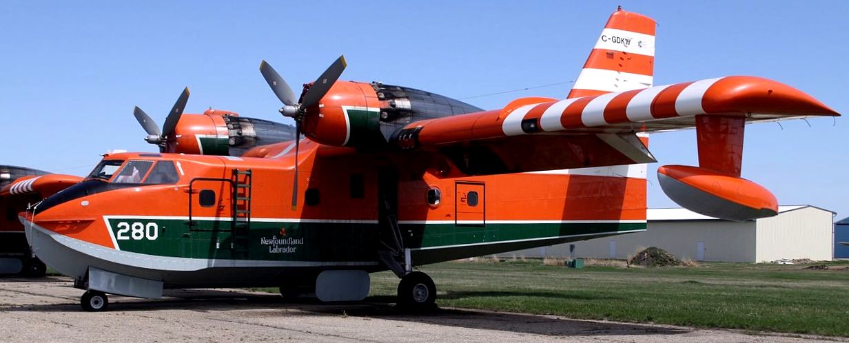 Canadair CL-215 (Scooper) C-GDKW, operated by the Government of Newfoundland and Labrador. The CL-215 is firefighting water bomber built by Canadair and later Bombardier. The twin engined CL-215 is designed to operate well at low speeds and in high gust-loading environments like as those found in forest fires.