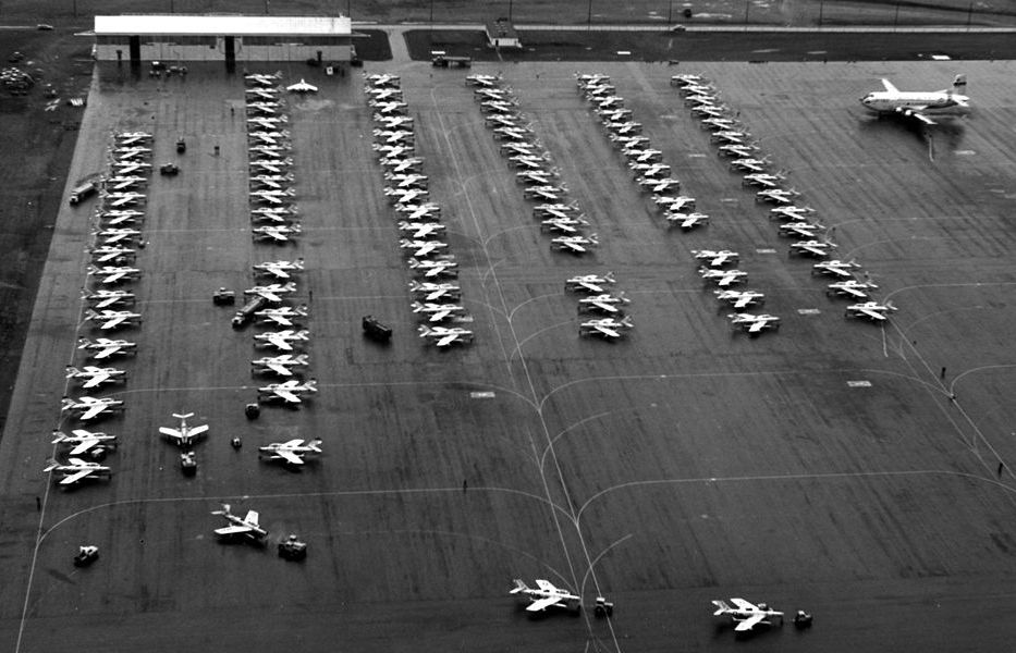 101 Republic F-84F Thunderstreak fighters of the U.S. Air National Guard and a single Douglas C-124 Globemaster II at Ernest Harmon Air Force Base, near Stephenville, Newfoundland, Nov 1961, prior to flying the Atlantic to Europe in response to the Berlin Crisis. Because of the long over-water distance to the next airfield in the Azores, the planes were towed to the end of the runway prior to takeoff to conserve fuel. During this Operation Stair Step deployment of more than 200 fighter aircraft (the largest overseas movement of a fighter force since the Second World War), not a single aircraft was lost.