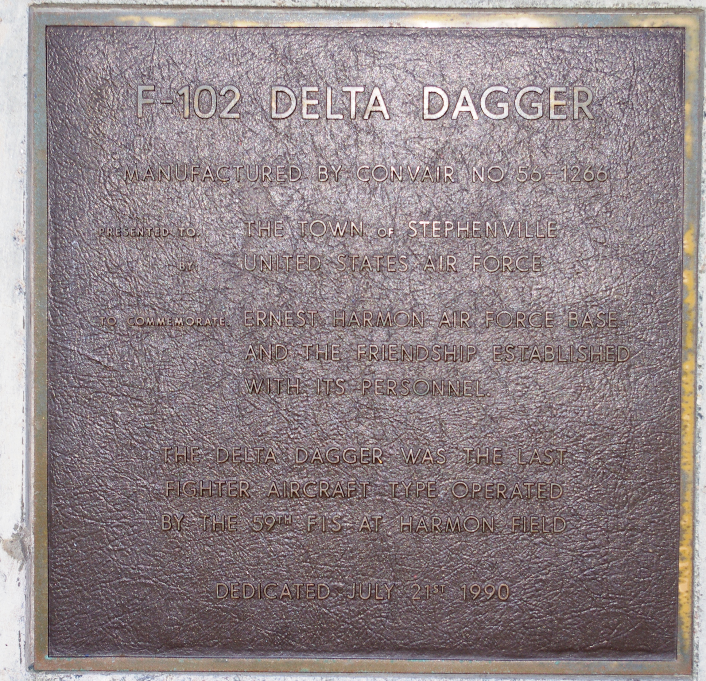Convair F-102A Delta Dagger (Serial No. 56-1266), USAF colours, mounted at the former Ernest Harmon US Air Force Base, Newfoundland, now Stephenville International Airport. Stephenville Air Base was renamed “Ernest Harmon Air Force Base” on 23 June 1948, in honor of Captain Ernest Emery Harmon. Capt Harmon was a US Army Air Corps pilot who was killed in an air crash in 1933.