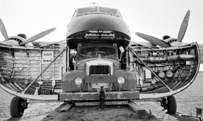Bristol 170 Freighter, Wardair, unloading a firetruck at Yellowknife, NWT, ca, 1954. (Library and Archives Canada Photo)