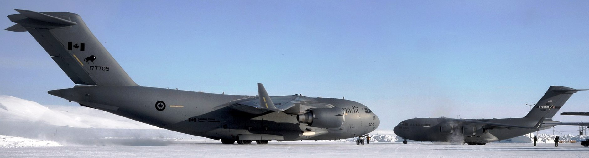Boeing CC-177 Globemaster (Serial No. 177705), from CFB Trenton, Ontario and a US C-17 aircraft from the 105th Airlift Wing of the New York Air National Guard, transported equipment and personnel to the Resolute Bay Airport, Nunavut, in preparation for Operation NUNALIVUT on 2 April 2016. (PO2 Belinda Groves Photo, New York Air National Guard)