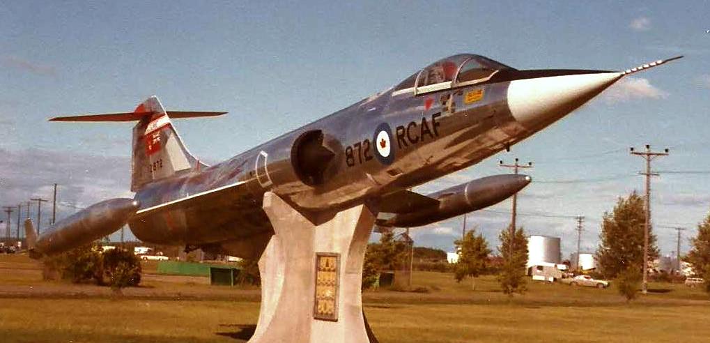 Canadair CF-104 Starfighter (Serial No. 12872), (Serial No. 104872), previously painted silver, now painted in dark cam, mounted on a concrete pylon at 4 Wing. This is a composite aircraft currently erroneously marked as (Serial No. 104880), (Serial No. 12880). There are four CF-104 Serial Numbers that are involved, including 12803, 12816, 12872 and 12880. The first one, (Serial No. 12803), crashed on its acceptance test flight 4 Sep 1962 and became Ground Trainer 685B. Next, (Serial No. 12816) caught fire in Zweibrucken, Germany, on 24 Jul 1963 during a run-up with the tail removed and was written off. On 11 Mar 1974, (Serial No. 12872) crashed while with 417 Sqn. The real (Serial No. 12880) became training aid 650C in Baden-Sollingen when it was retired in 1983 and it seems it was scrapped sometime after that in Germany.