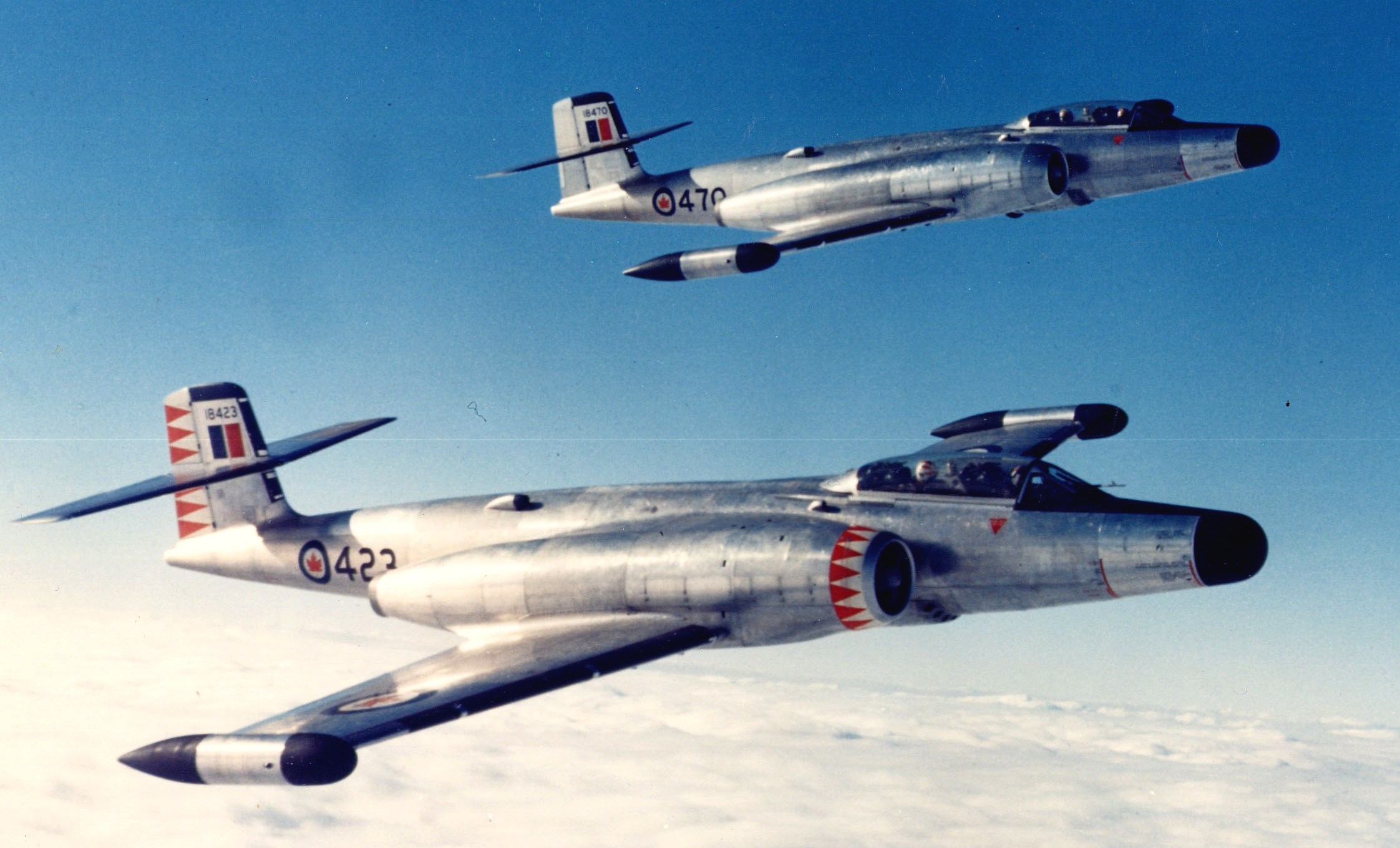 Avro CF-100 Canuck Mk. 5 pair in flight. (RCAF Photo courtesy of the Canadian Aviation Preservation Association)