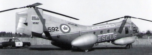 Piasecki Vertol H-44 Workhorse Helicopter (Serial No. 9592), CF-BSG. This RCAF CH-127 (Vertol H-44A) originally served with the USAF (Serial No. 60-5446). It was acquired by the RCAF on 11 May, 1960, and initially served at RCAF Station Trenton, Ontario with No. 4 OTU prior to being transferred to No. 103 Rescue Unit at RCAF Station Greenwood, Nova Scotia on 8 May, 1961. It remained there until being transferred to Air Defence Command and flown to RCAF Station Chatham, New Brunswick on 20 October 1964. (It is shown here in a baseball park at Liverpool, Nova Scotia in 1966). From there it went to AMDU’s detachment at Mountainview, Ontario on 22 Nov 1971 for disposal. It was subsequently purchased by Nahanni Helicopters in Delta, British Columbia and registered as CF-BSG.