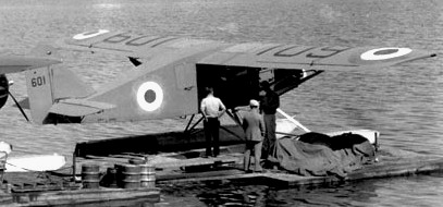 Canadian Vickers CH-300 Pacemaker 31 floatplane, RCAF (Serial No. G-CYVB), later (Serial No. 605), with aircrew securing a boat to the fuselage of the aircraft, 28 May 1931.