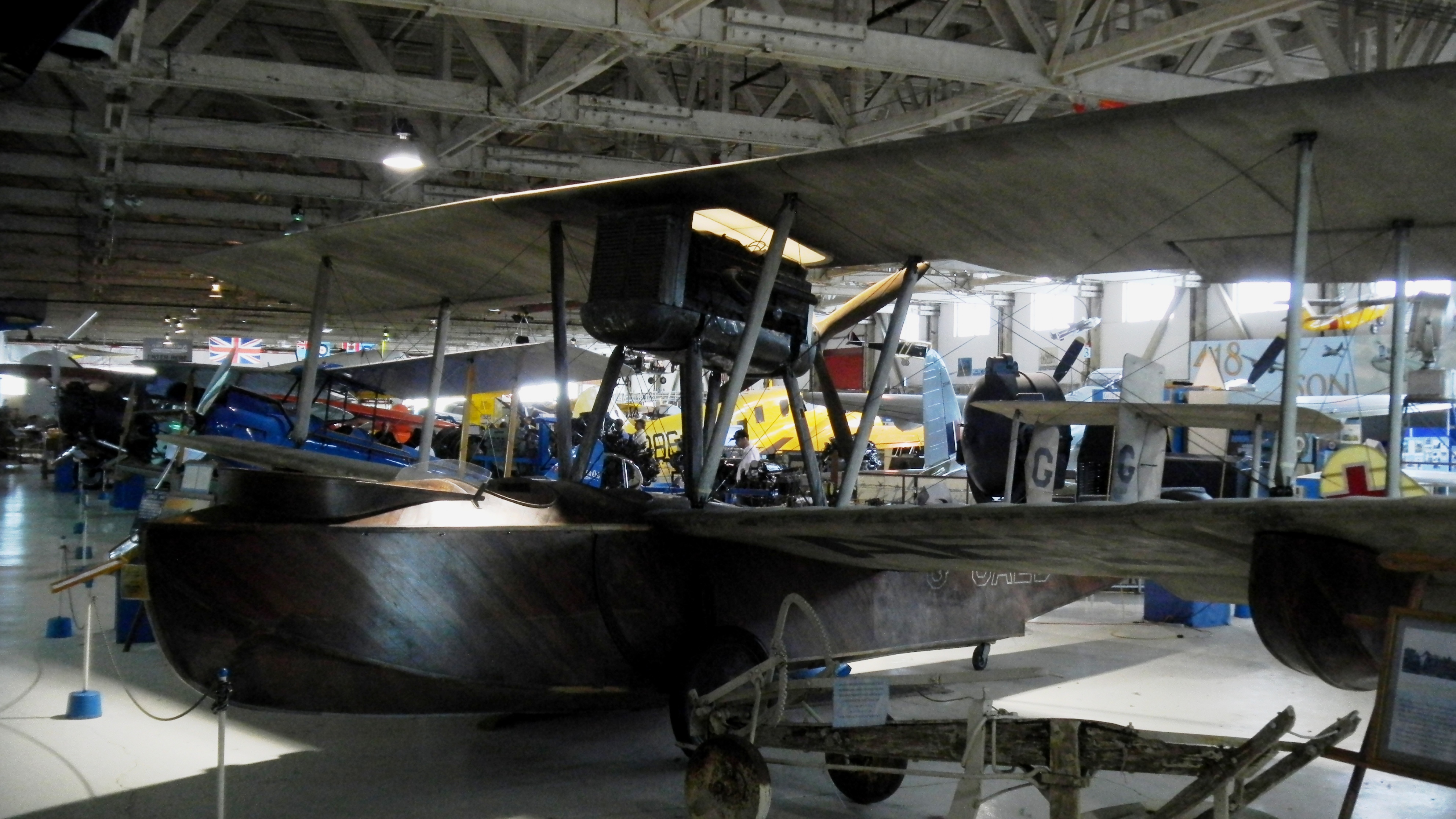 Canadian Vickers Viking Mk. 4, G-CAEB, 7/8-scale replica.  The Viking was amphibious, which meant it could operate off water or land. It was a single-engine biplane with a nearly flat-sided hull. It was manufactured in Canada by Canadian Vickers utilizing durable, seasoned Canadian timber. Eight Vikings were ordered by the Canadian Air Force in 1923 and were operationally deployed from 1924 to 1931.  The Museum’s 7/8 scale replica of Viking G-CAEB is on loan from the Bomber Command Museum in Nanton and was originally built for the 1993 movie “Map of the Human Heart.”