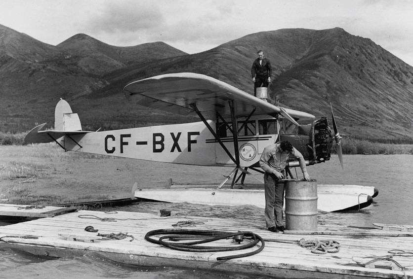 Two bush pilots refueling their Northern Airways Fairchild FC-2W2 (later converted to a model 71C in 1949), Reg. No. CF-BXF.