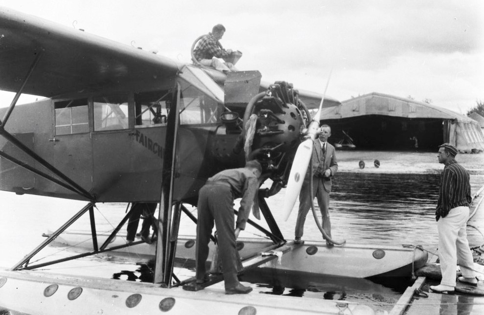 Fairchild 71 used in a Trans-Canada flight showing S/L Godfrey inspecting the aircraft’s Wasp motor, 18 August 1928.