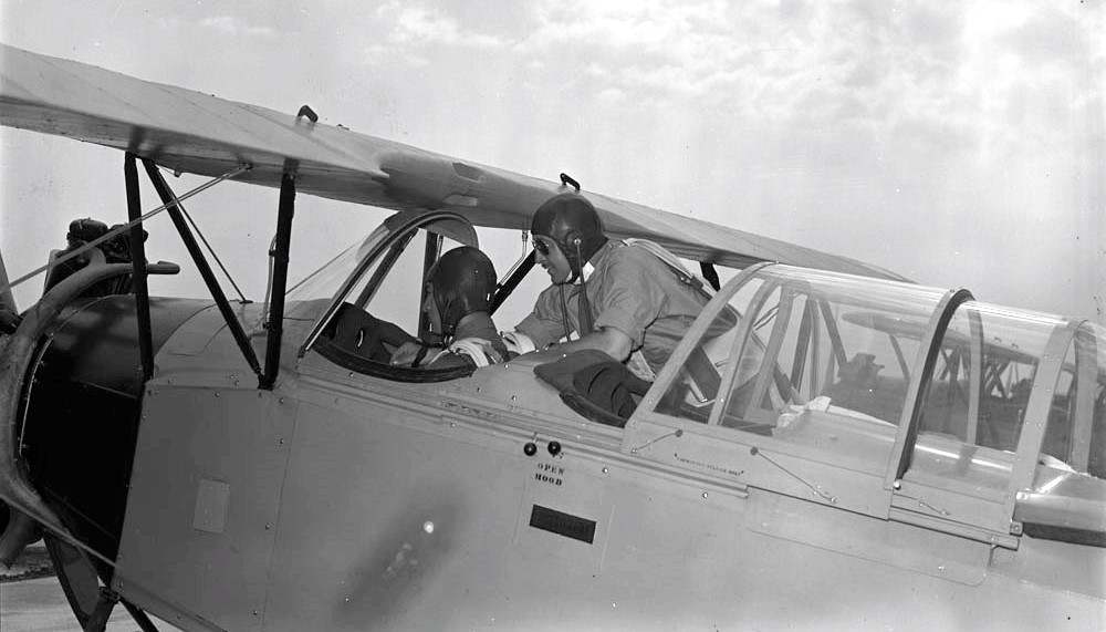 St A.J. Lewis giving instruction to Elementary Flying Training School student J.E. Reid, in the cockpit of a Fleet Finch Mk. II, 22 July 1940.