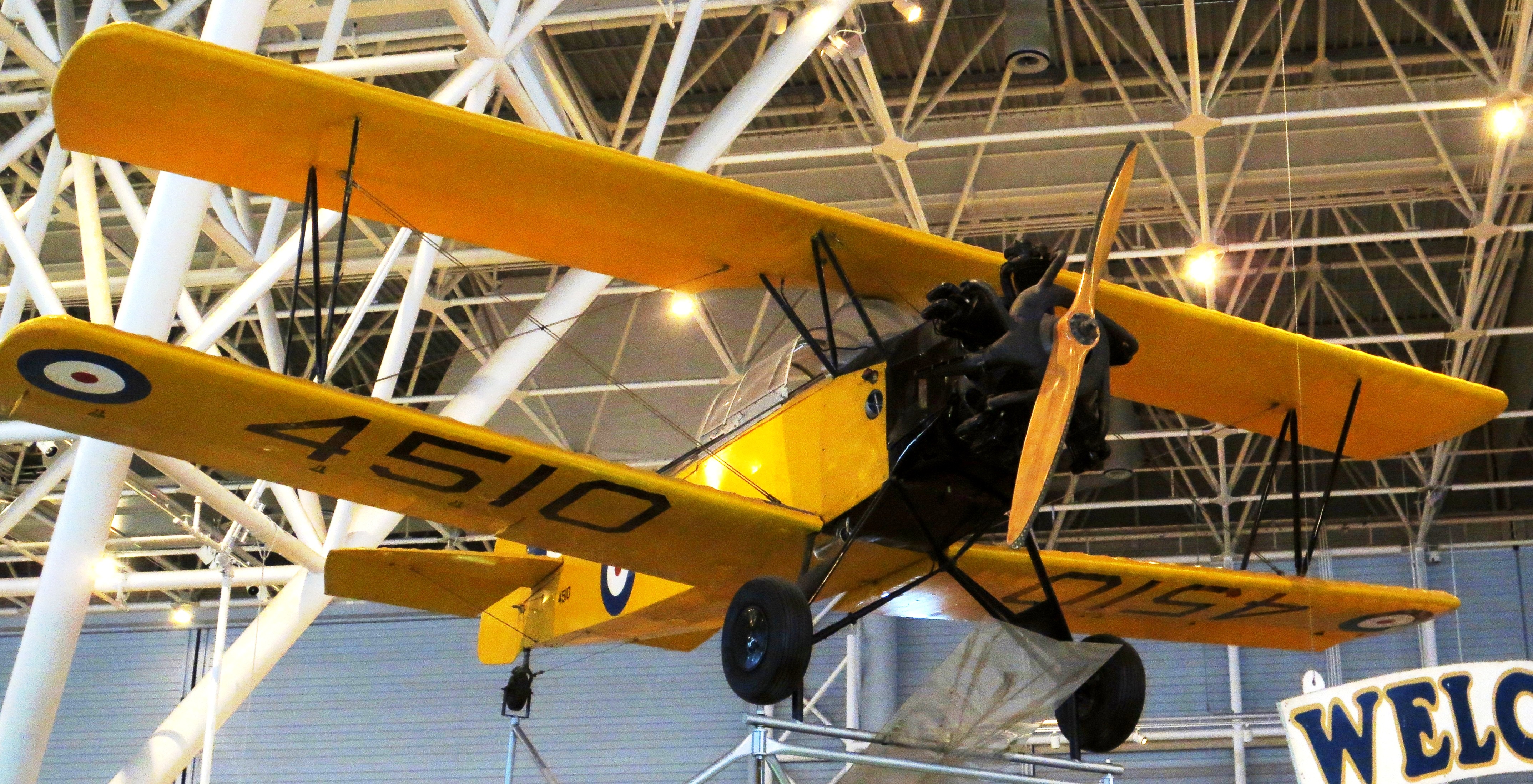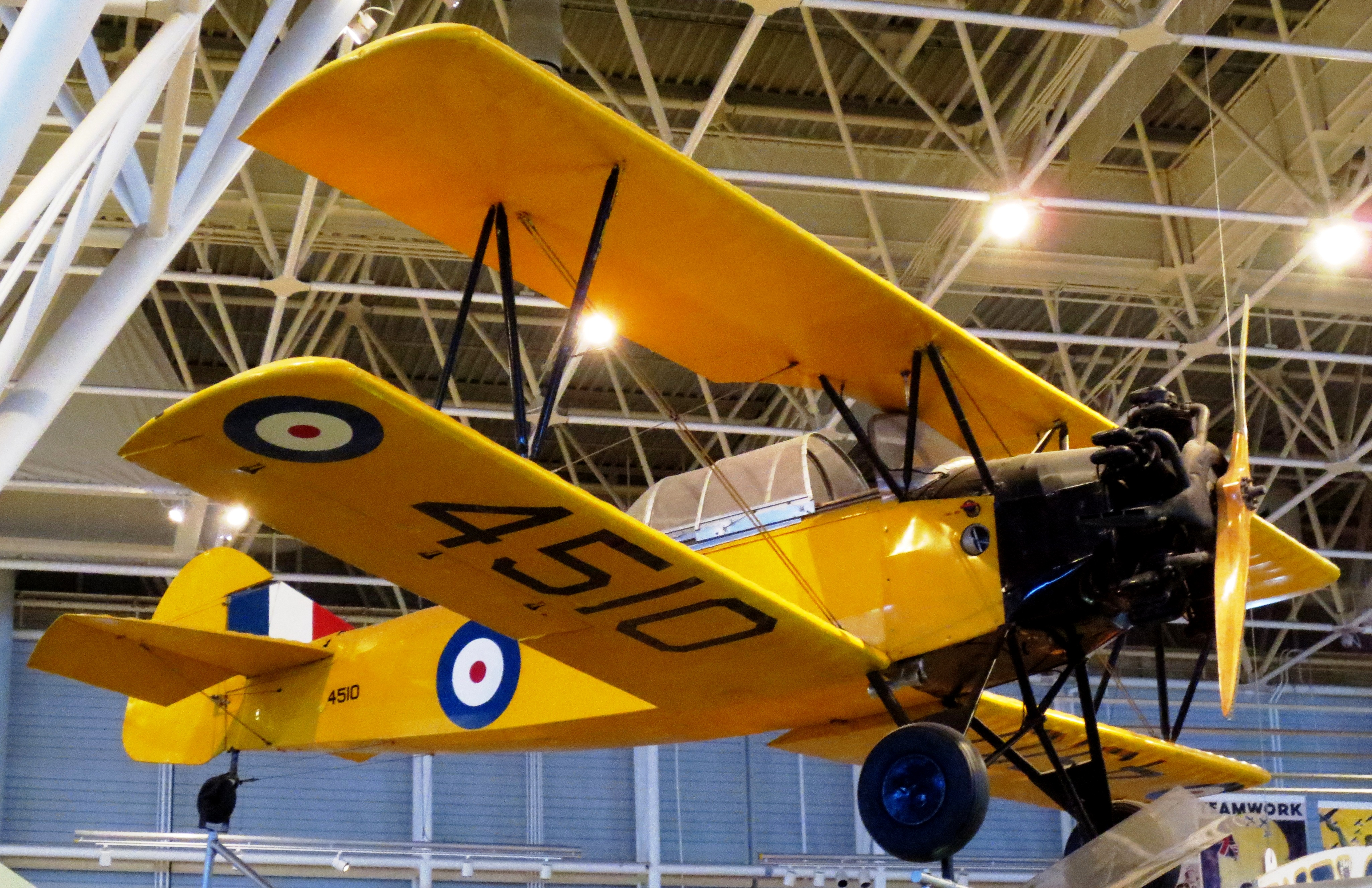 Fleet Finch Mk. II, RCAF (Serial No. 4510), (408).  This Finch was manufactured by Fleet Aircraft Limited in Fort Erie, Ontario in July 1940.  It was taken on strength by the RCAF and used at Elementary Flying Training Schools in London, Ontario and Cap-de-la-Madeleine, Quebec.  Put in long-term storage in St-Jean, Quebec in 1943, it was passed to the War Assets Commission in 1945, sold in 1947 to two private American owners, and given the civilian registration NC1327V in New York.  The Finch returned to Canada in 1964, when it was purchased by Dr. D.A. McLean of Toronto and restored in its original RCAF markings by No. 400 Reserve Squadron at Downsview Airport.  In June 1966, after restoration, McLean donated the aircraft to the RCAF’s historic aircraft collection.  The Finch was flown to Ottawa in September and then transferred to the Museum.  As part of the Museum’s collection, it was flown on Air Force Day in 1967 and displayed at Toronto’s Canadian National Exhibition in 1970.  This Finch was missing a cockpit enclosure until one was donated in 1976 by Clifford Glenister of Toronto.  (CA&SM)