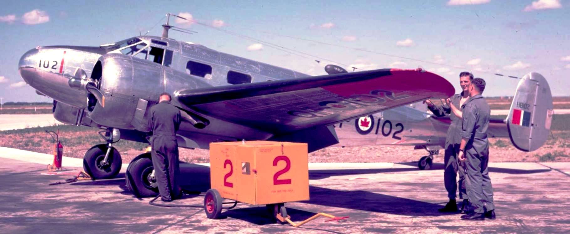 Beechcraft CT-128 Expeditor Mk. 3T, RCAF (Serial No. HB102) c/n 5780, UC-45B ex-USAAF (Serial No. 43-35466), QP102, 1943. No. 406 Squadron, Saskatoon. No. 406 Squadron codes were AH and XK. This Expeditor is from No. 1 Advanced Flying School at Saskatoon, Saskatchewan. Expeditor aircrew members F/O Paul Duyns and F/O Al Sovran inspect the aircraft prior to take off, while a ground crew member plugs in the energizer.