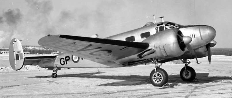 Beechcraft C-45 Expeditor Mk. IMN/3T (Serial No. HB11), coded GP-VC, 2 April 1951. This was a D-18S, delivered as a Mk. I. HB11 was converted post war to a Mk. 3T. It was transferred from RCAF Station Pennfield Ridge, New Brunswick, to No. 6 Operational Training Unit at RCAF Station Comox, British Columbia, in September 1945. The aircraft is wearing the unit code “GP”, No. 1 Flying Training School, RCAF Station Centralia, Ontario.