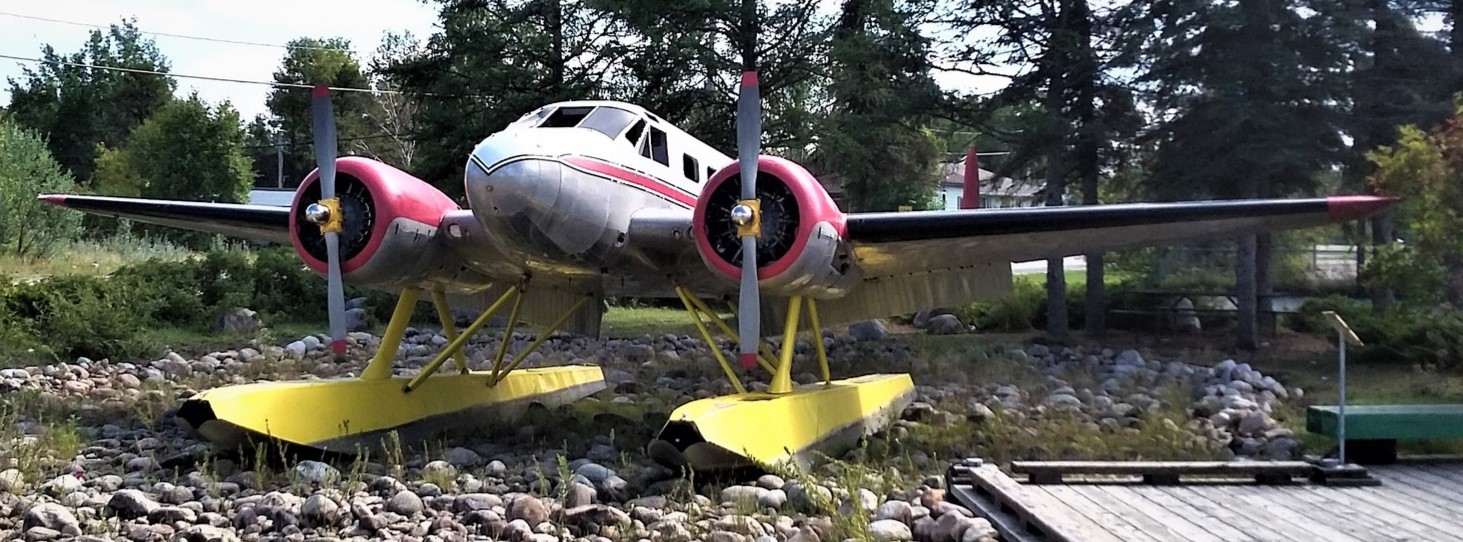Beechcraft CT-128 Expeditor Mk. 3TM (Serial No. A-725), (Serial No. CA-125), RCAF (Serial No. 1525), later chabged to RCAF (Serial No. 5184), Reg. Nos. CF-ZQG, CF-EAR, silver, mounted on a pylon on the grounds of the Ear Falls District Museum, Ear Falls, Ontario.