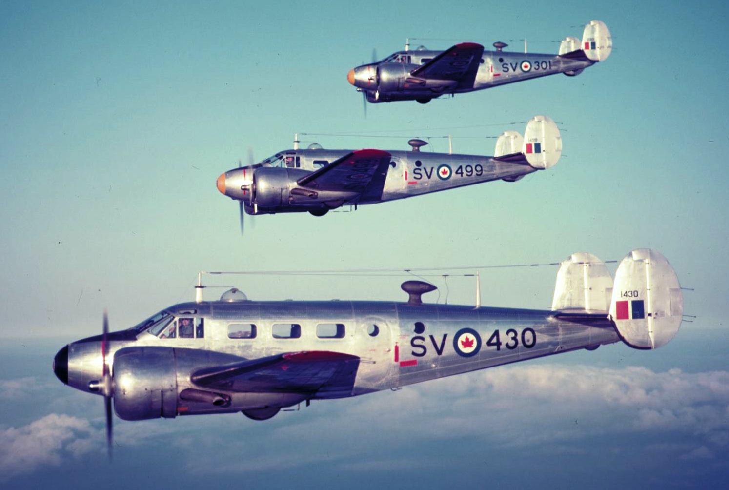 Beechcraft CT-128 Expeditor Mk. 3N, RCAF (Serial No. 1430), (Serial No. 1499), and (Serial No. 301), coded SV, No. 17 Wing.