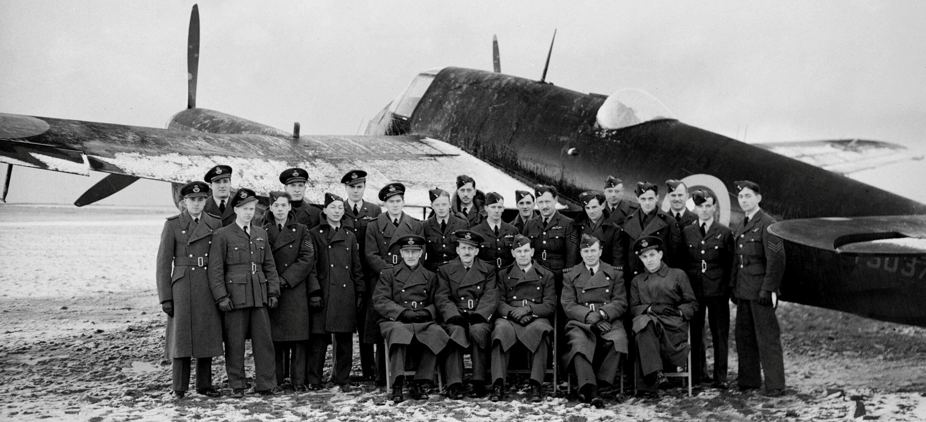 Bristol 156 Beaufighter Mk. IIF (Serial No. T3037), B Flight of No. 409 Squadron, RCAF, based at RAF Station Aklington, Northumberland, Jan 1942. No 409 Squadron was Fighter Command’s first Canadian night-fighter unit. Members are shown here posing for a formal portrait with one of their Merlin-engined Beaufighter Mk. IIFs.