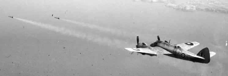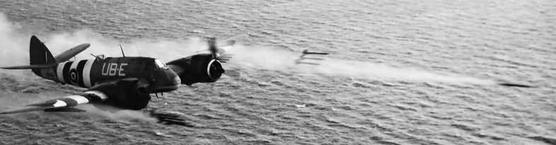 Bristol Beaufighter TF Mk. X of No. 404 Squadron RCAF, based at Davidstow Moor, Cornwall, firing a pair of 3-inch rocket projectiles on a range off the Cornish coast.