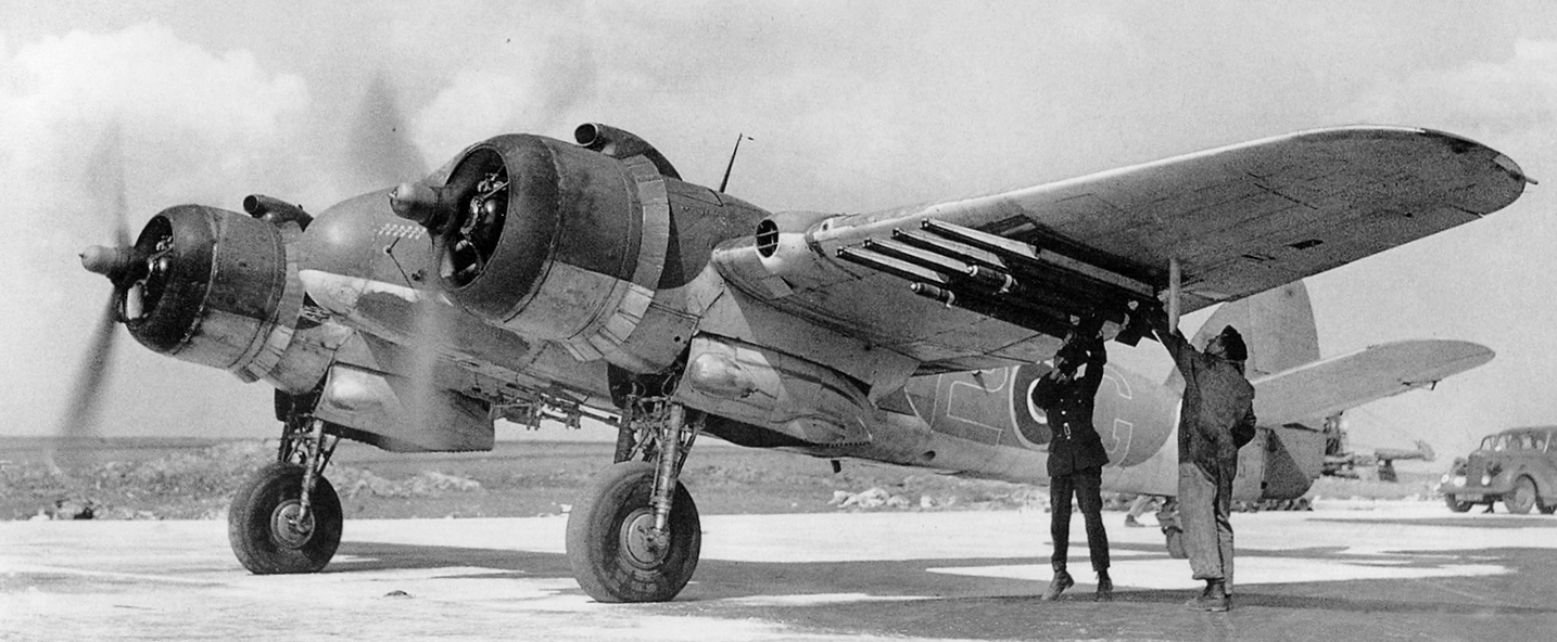 Bristol Beaufighter Mk. X (Serial No. NE425), coded 2–G, No. 404 Squadron, RCAF, later coded EE, being fitted with 3-inch 25 lb rockets.