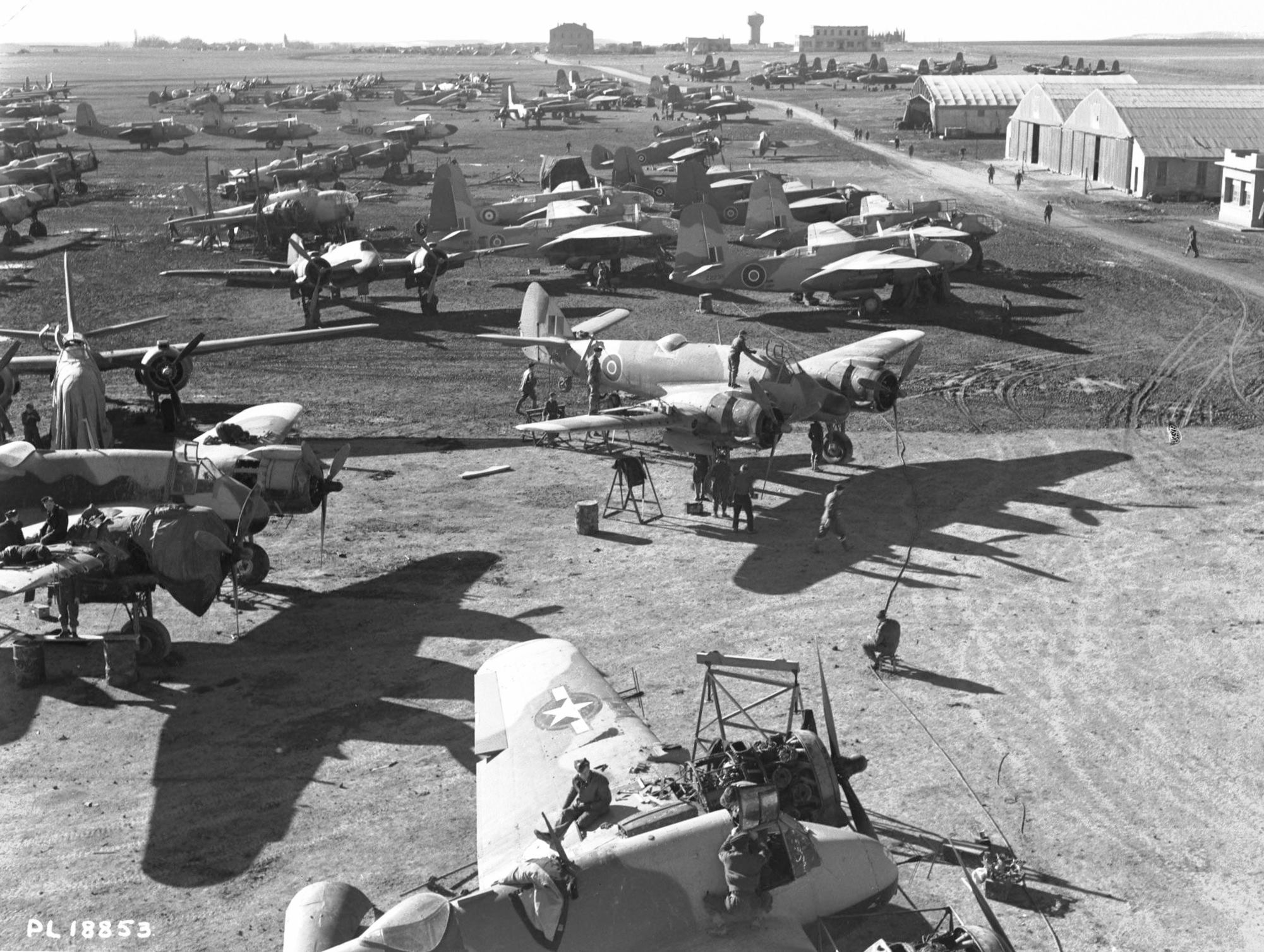 RCAF, RAF and USAAF aircraft at an airfield likely in the Mediterranean Theatre of Operations. USAAF Bristol Beaufighter undergoing maintenance in the foreground, RAF Beaufighters, RAF Douglas Bostons, USAAF Douglas A-20 Havocs, RAF Martin Baltimores, USAAF Martin B-26 Marauders (upper right).